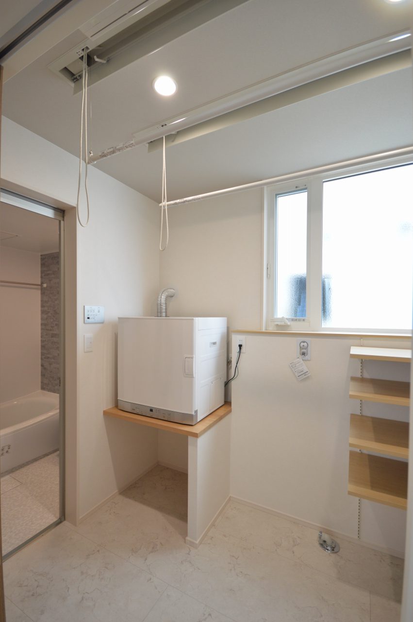 乾太くん、物干しスペース、収納棚と、充実の設備が詰まったランドリー。