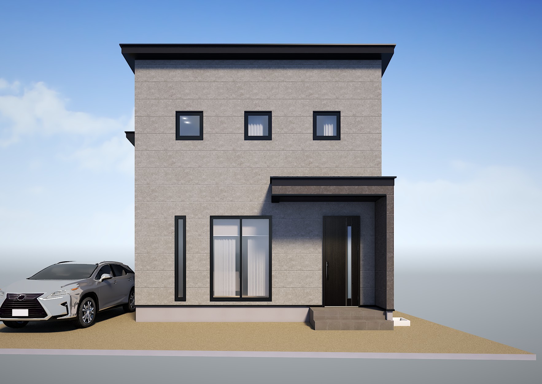 外観は凹凸の無いフラットな外壁材からブラックとライトグレーの2色を採用。