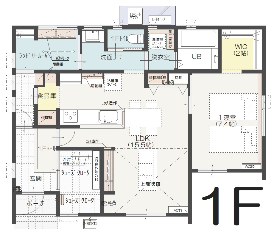 ■浴室、脱衣室、洗面コーナー、ランドリールームと水回りが一直線に繋がる家事ラク動線