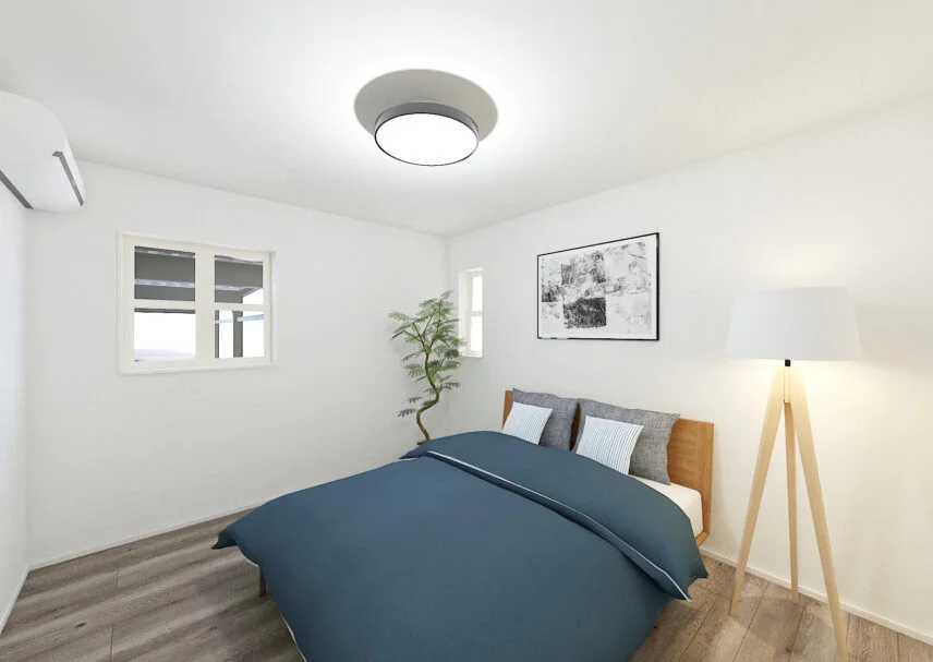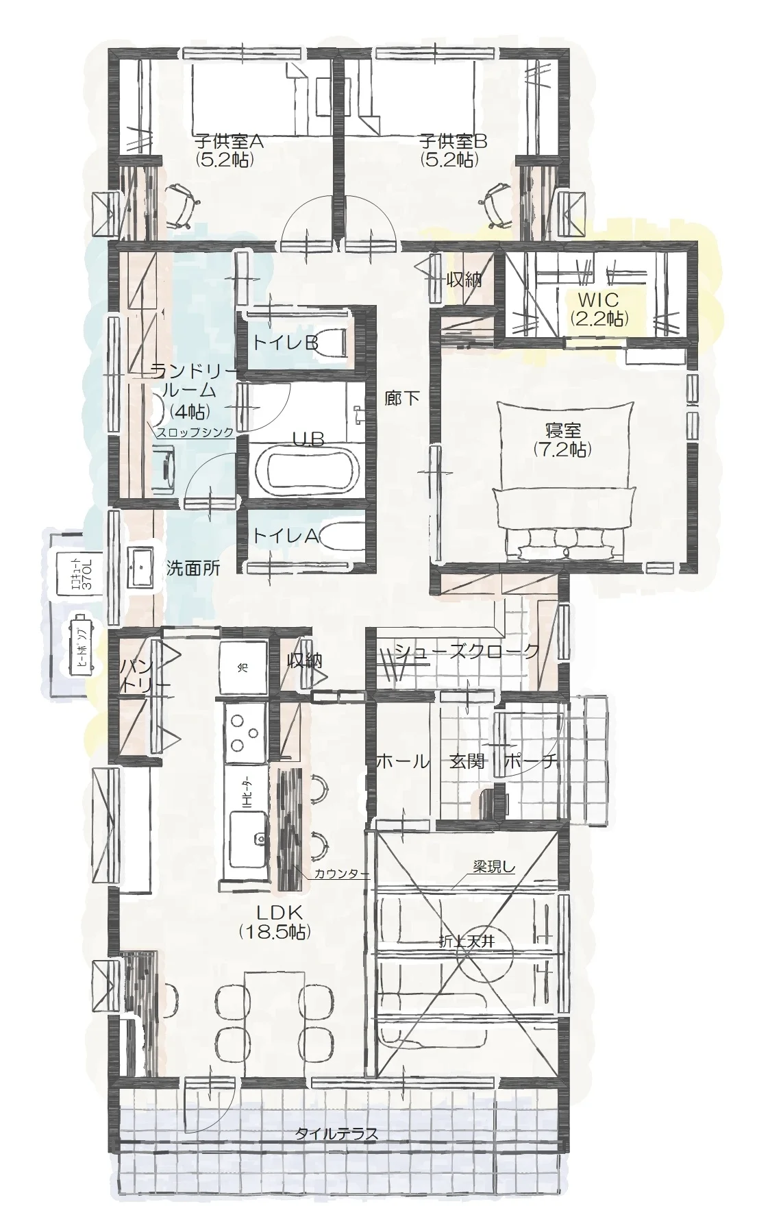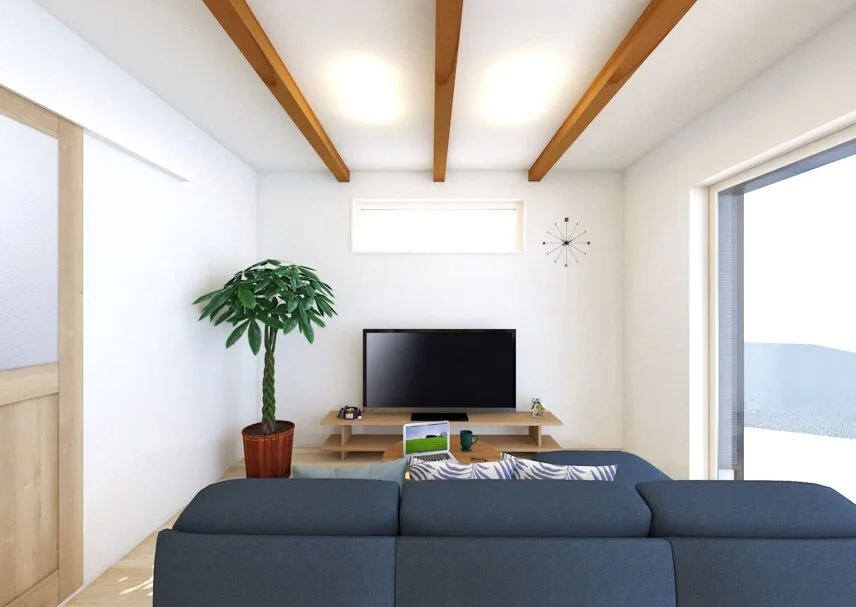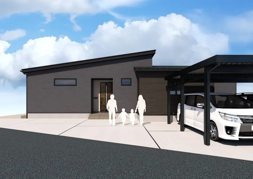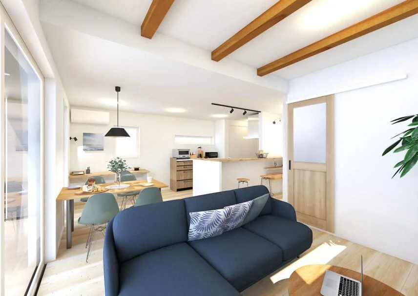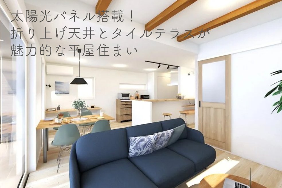 生活が1階で全て完結する人気の平屋!あらわし梁をアクセントにした折り上げ天井で開放感のあるリビングを生み出します。また、LDKから行きき出来るタイルテラスでアウトドアも楽しむことができ、おうち時間を満喫。延床面積約30坪のコンパクトサイズのお住まいが完成いたしました。