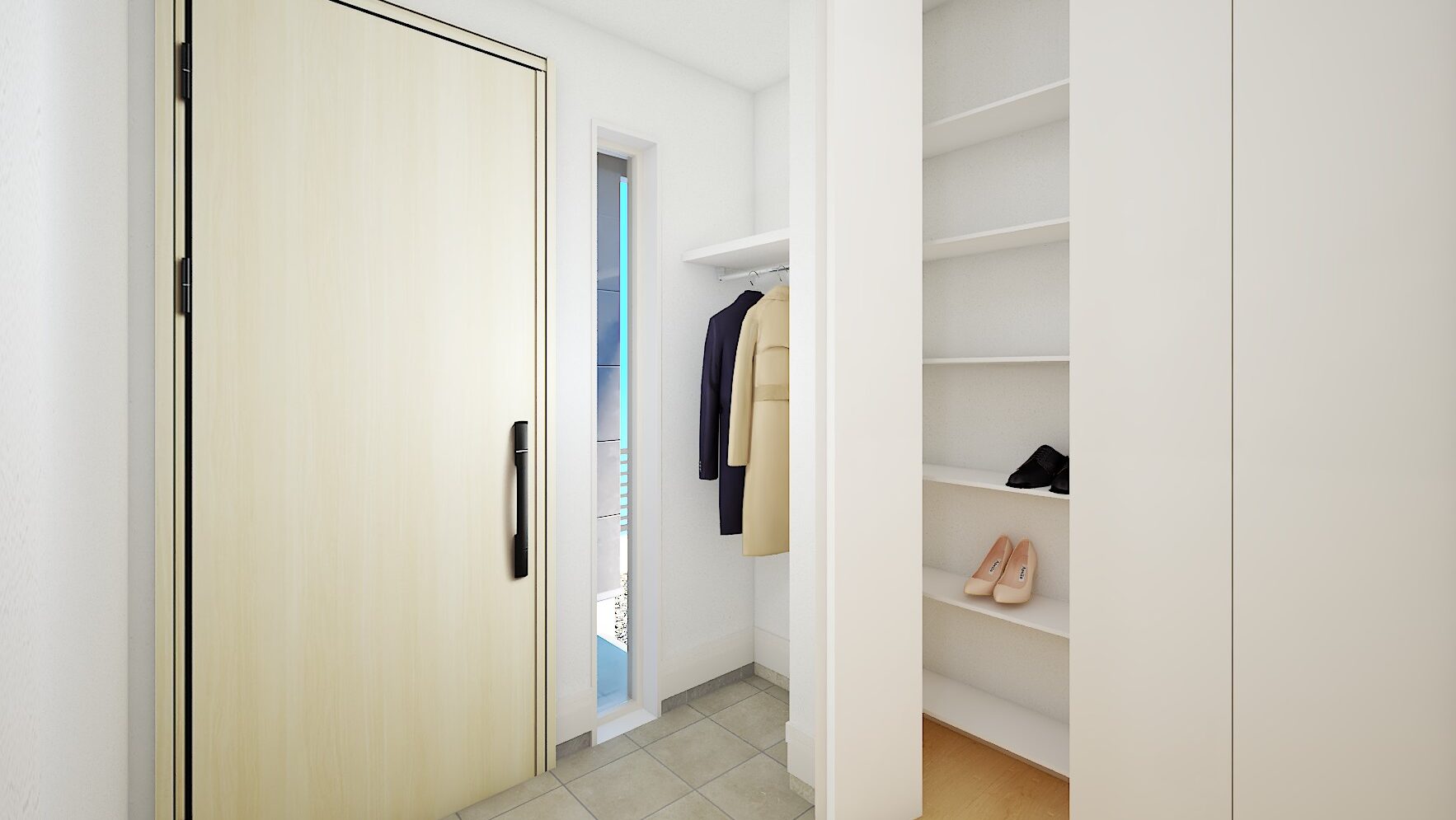 1Fには落ち着きのある和室に加え、家事ラク動線のランドリースペース&WICも完備