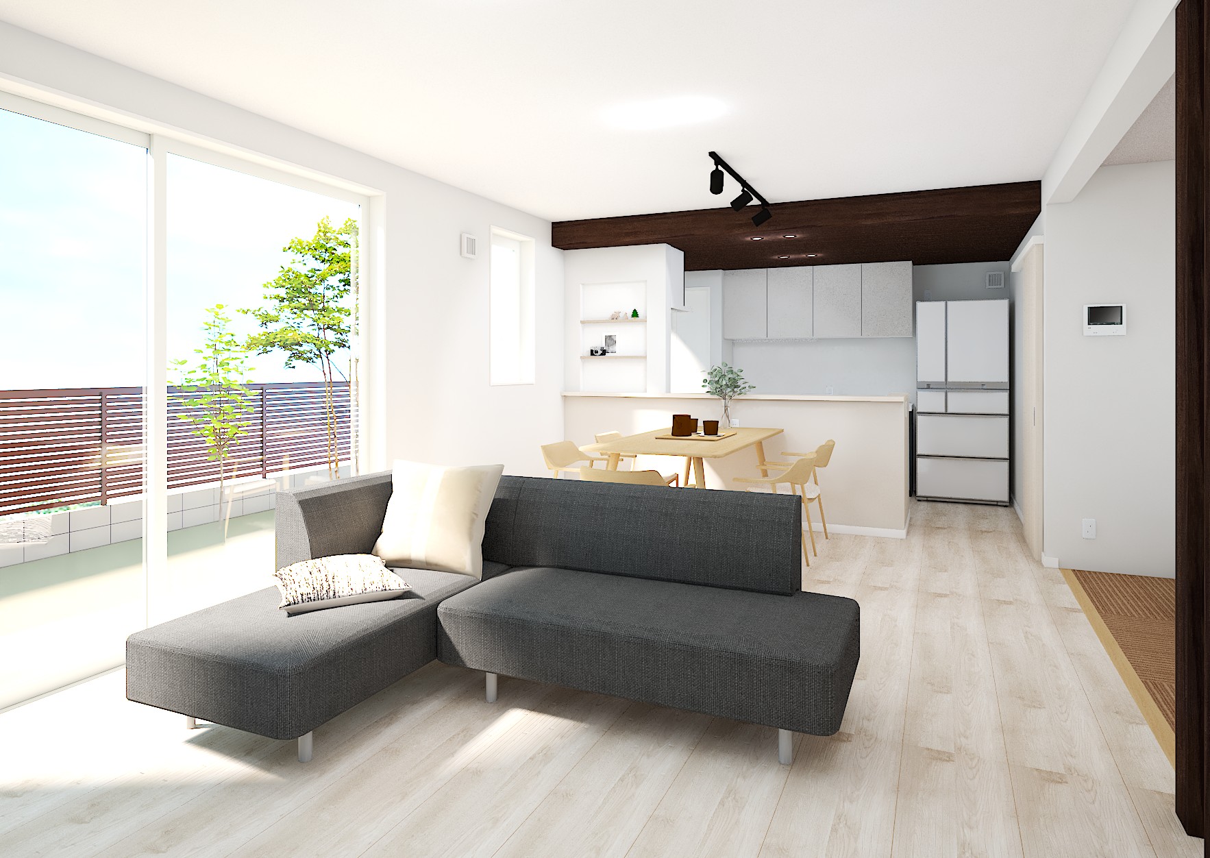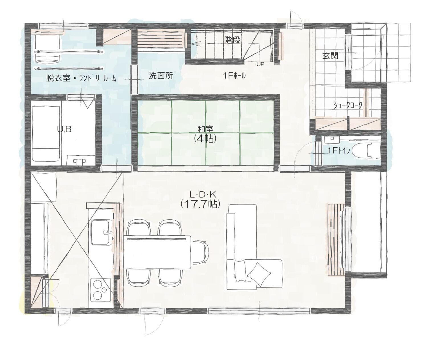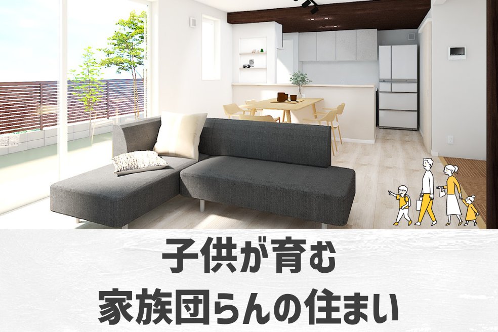 子育て世代のご家族で1階LDK、茶の間を開放的に21.7帖のスペースを取り、ご家族の中心の場・憩いの空間とする設計