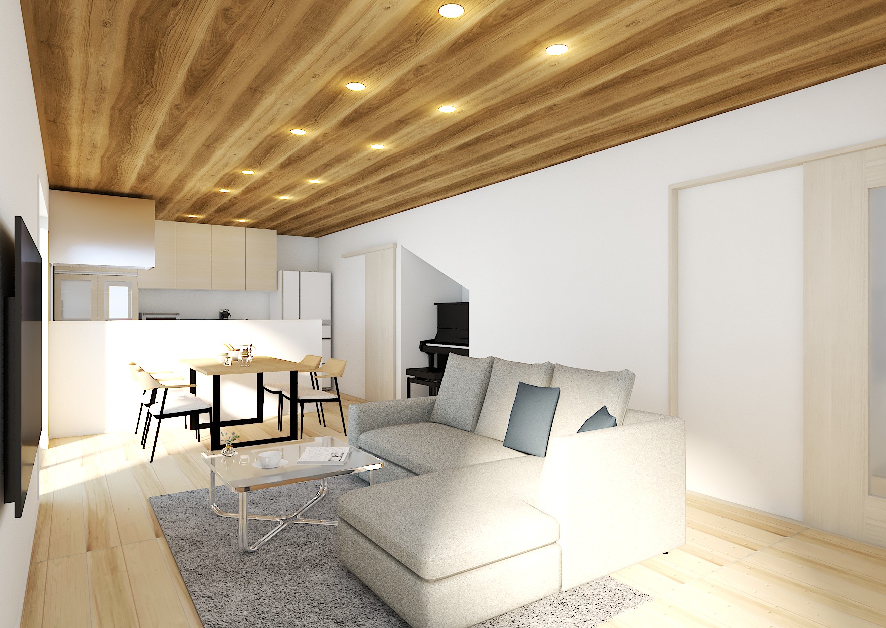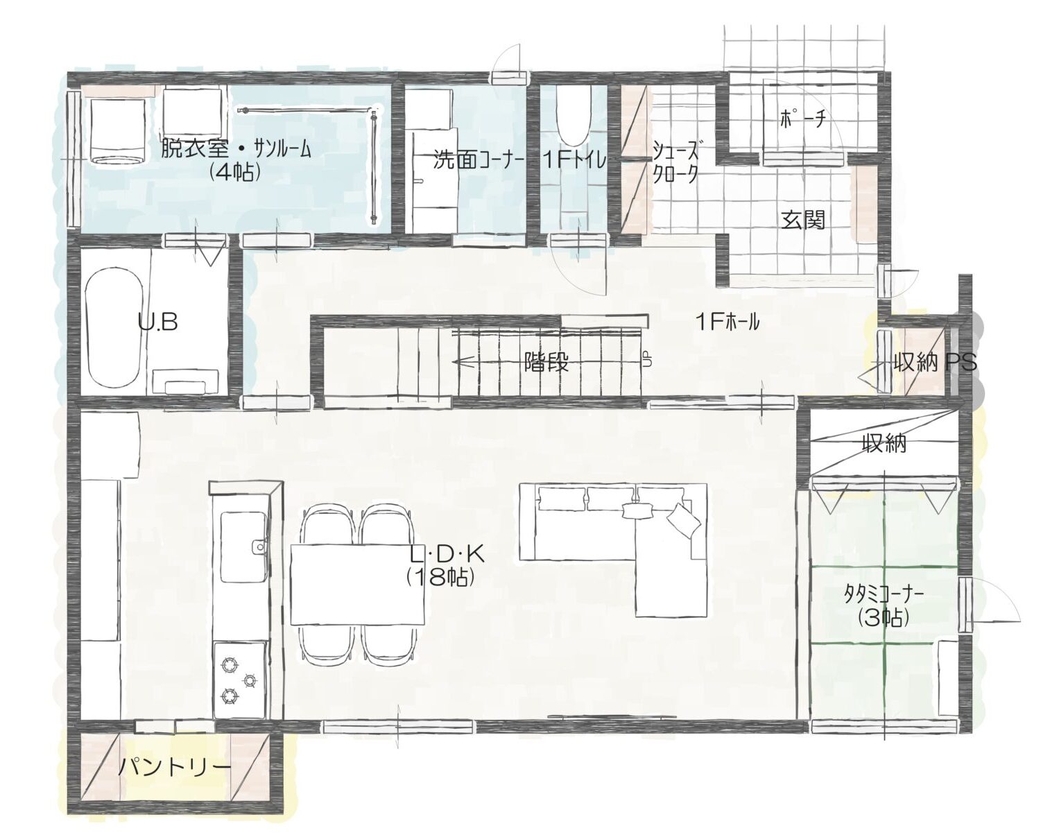 生活空間としてLDK(タタミコーナー含む)20.6帖に趣味のピアノを置き、ご家族の憩いの場を中心としたプランに仕上げました。
