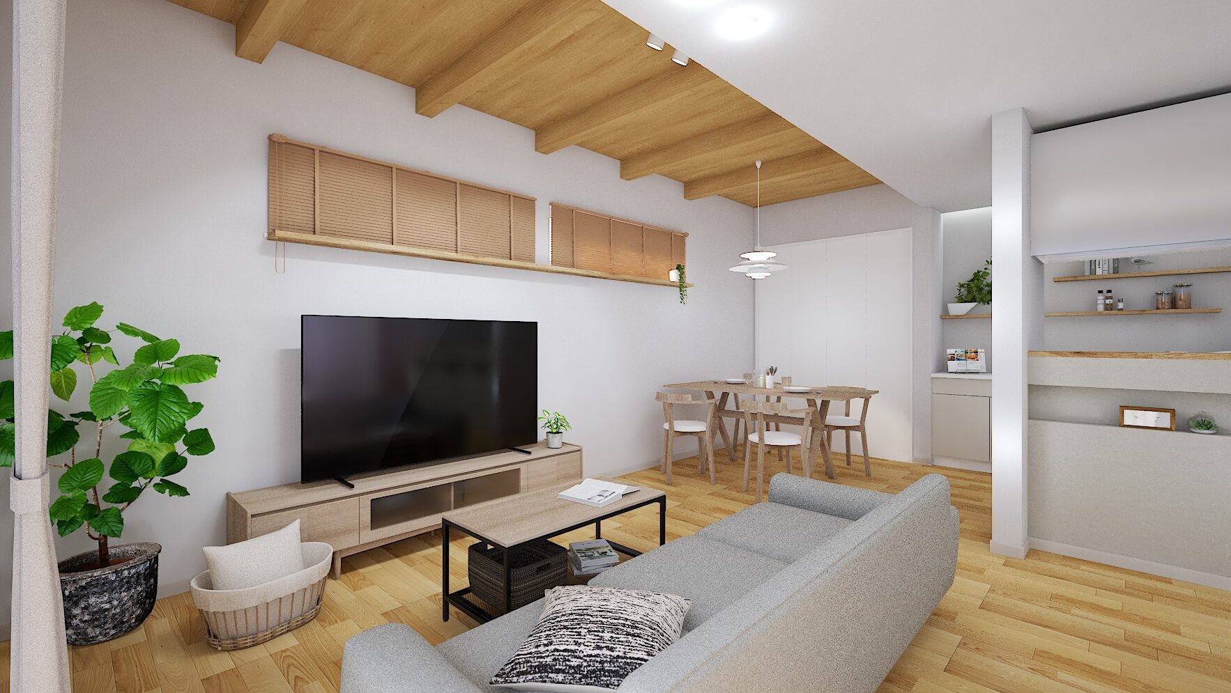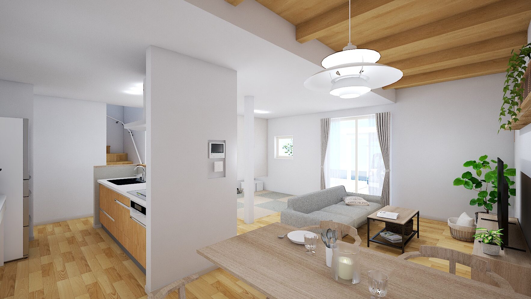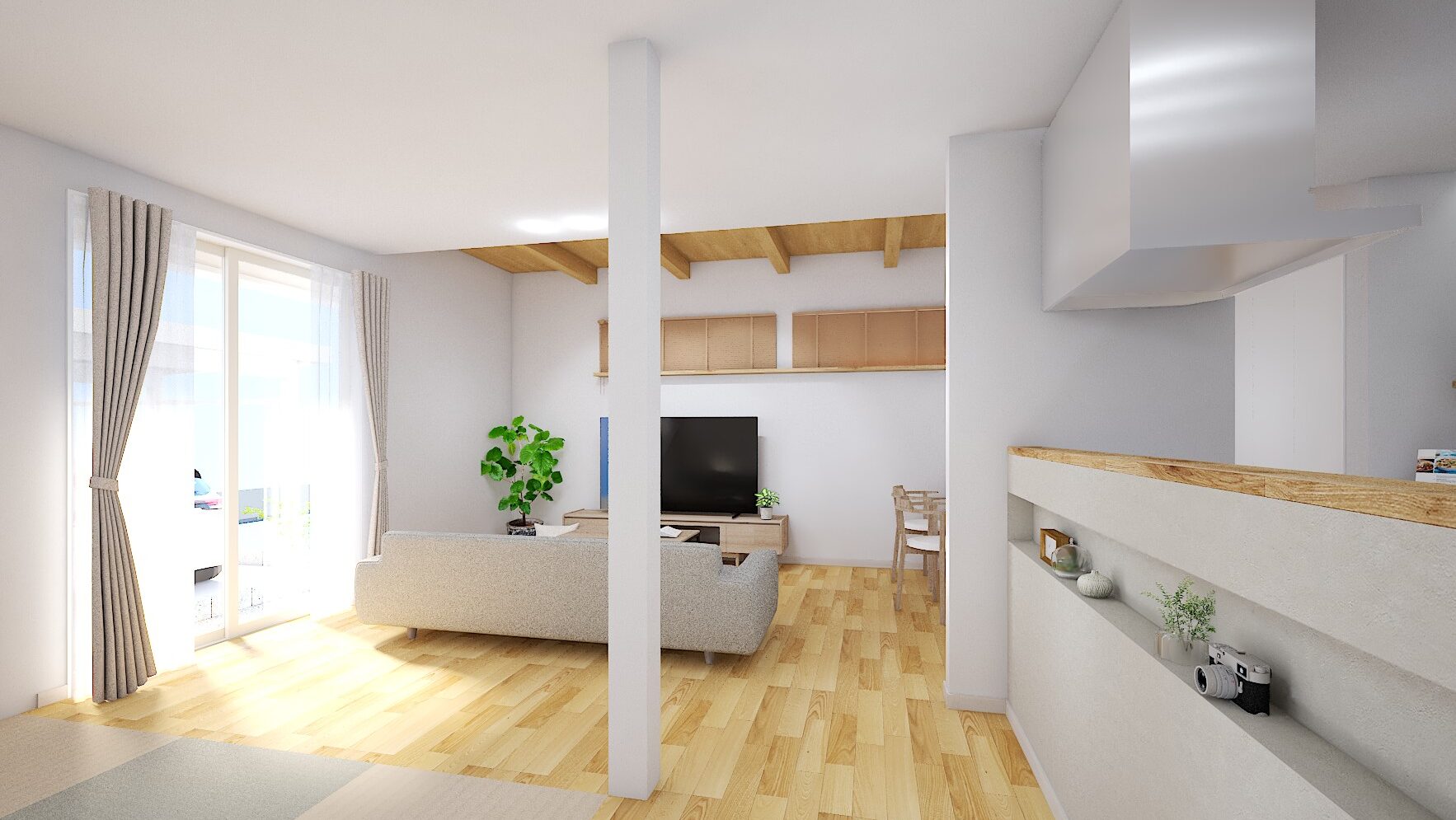 室内は、吹抜け天井と木目梁が温かみを演出する広々リビングが見どころ!