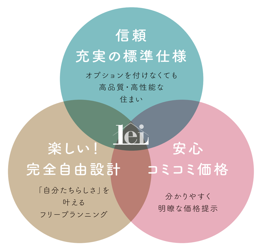 住み心地の良い空間設計と暮らしやすいデザインが揃った理想の家を お求めやすい価格で提供する。それが[Lei -レイ-]の特徴です。