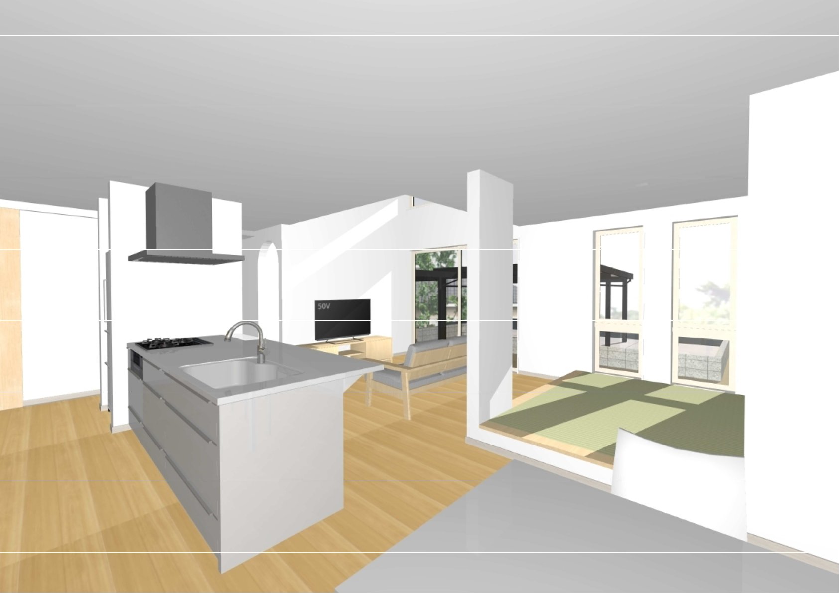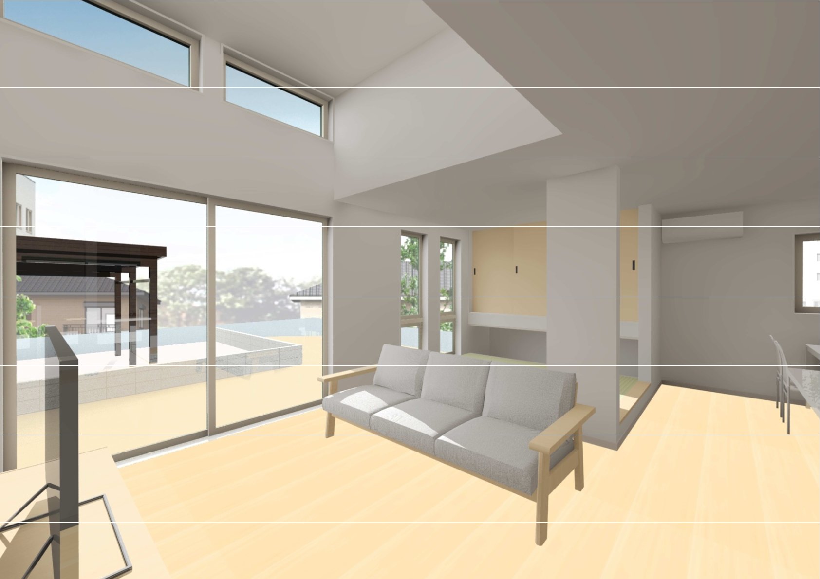 約22帖の広々としたLDK、リビングは高天井で、開放感と明るさを感じられる空間に。