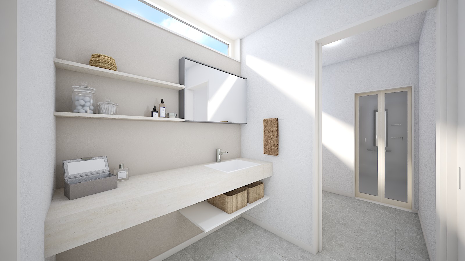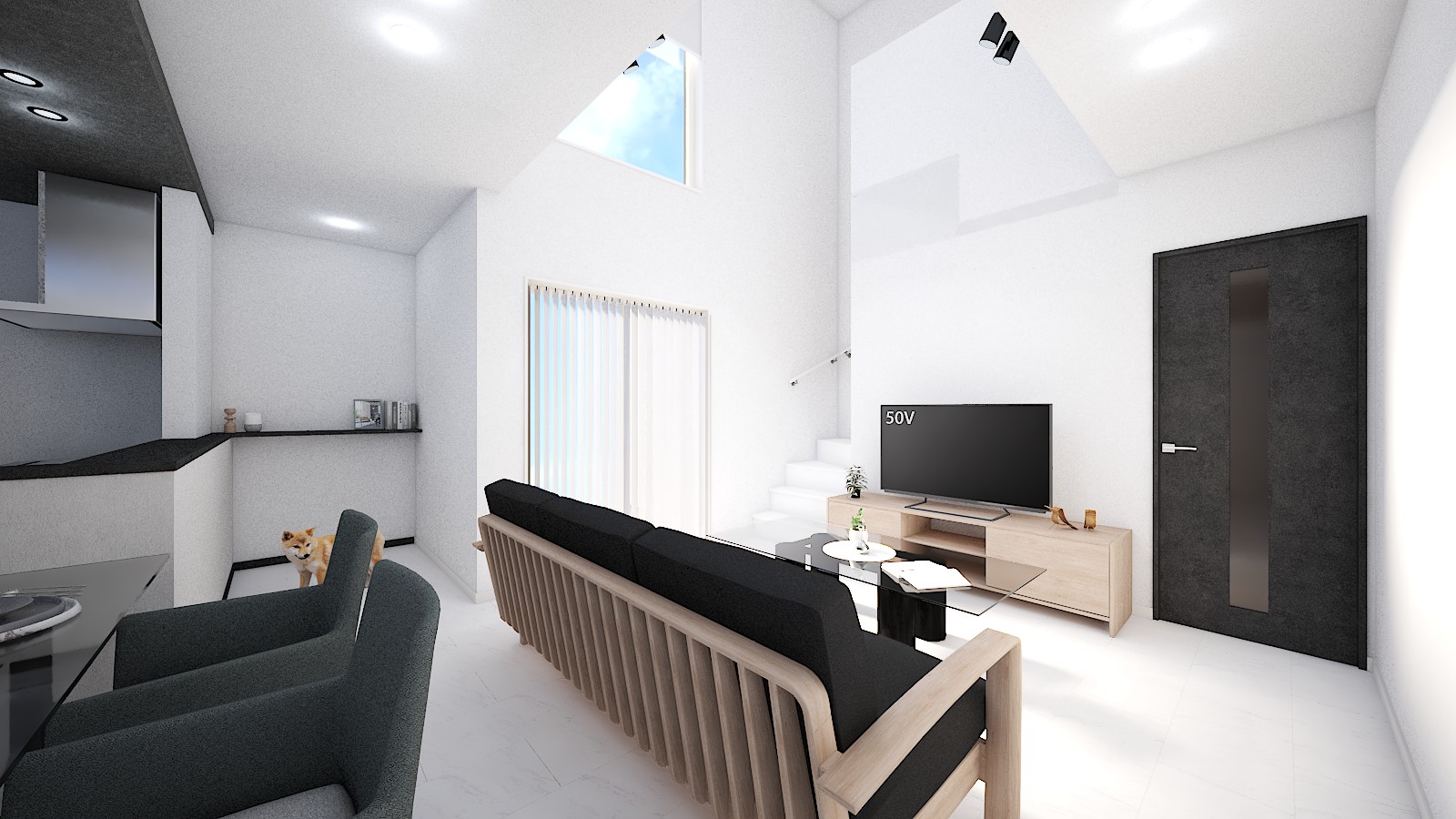 1階は白い大理石調の床とホワイトの建具で統一し、アクセントにブラックを取り入れたモノトーンスタイル。