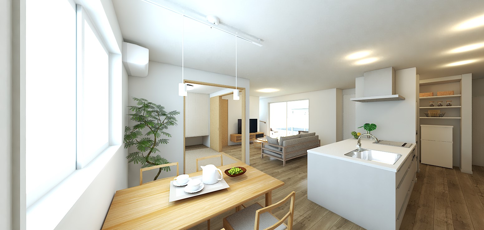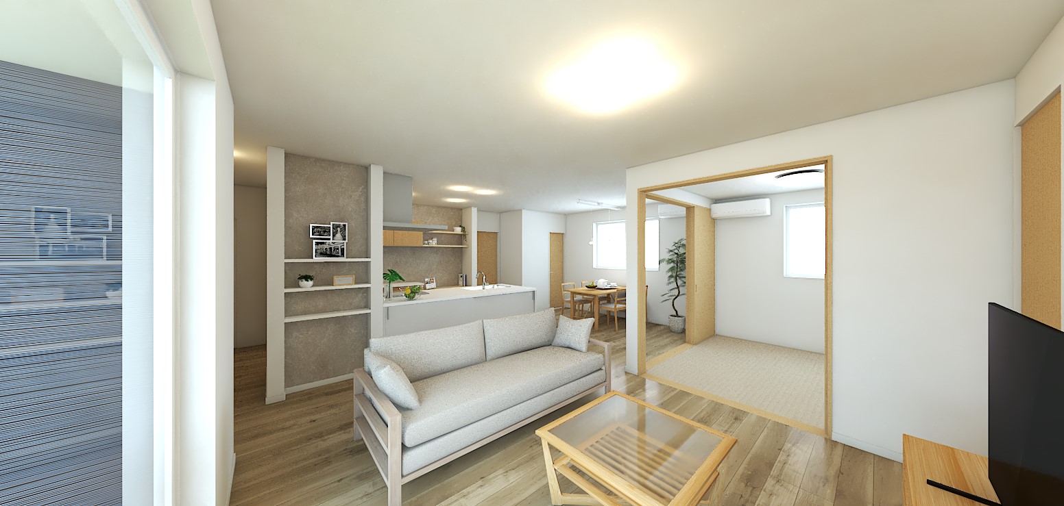 ✓リビング一角に設けた和室は二面開口でワンルームに。和室収納は吊押入にすることでより空間を広く見せる