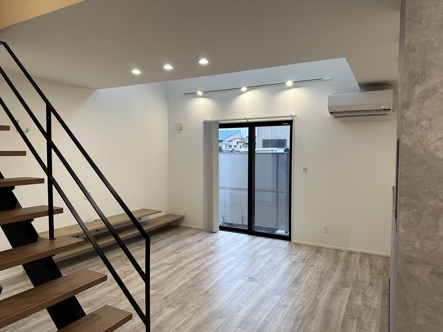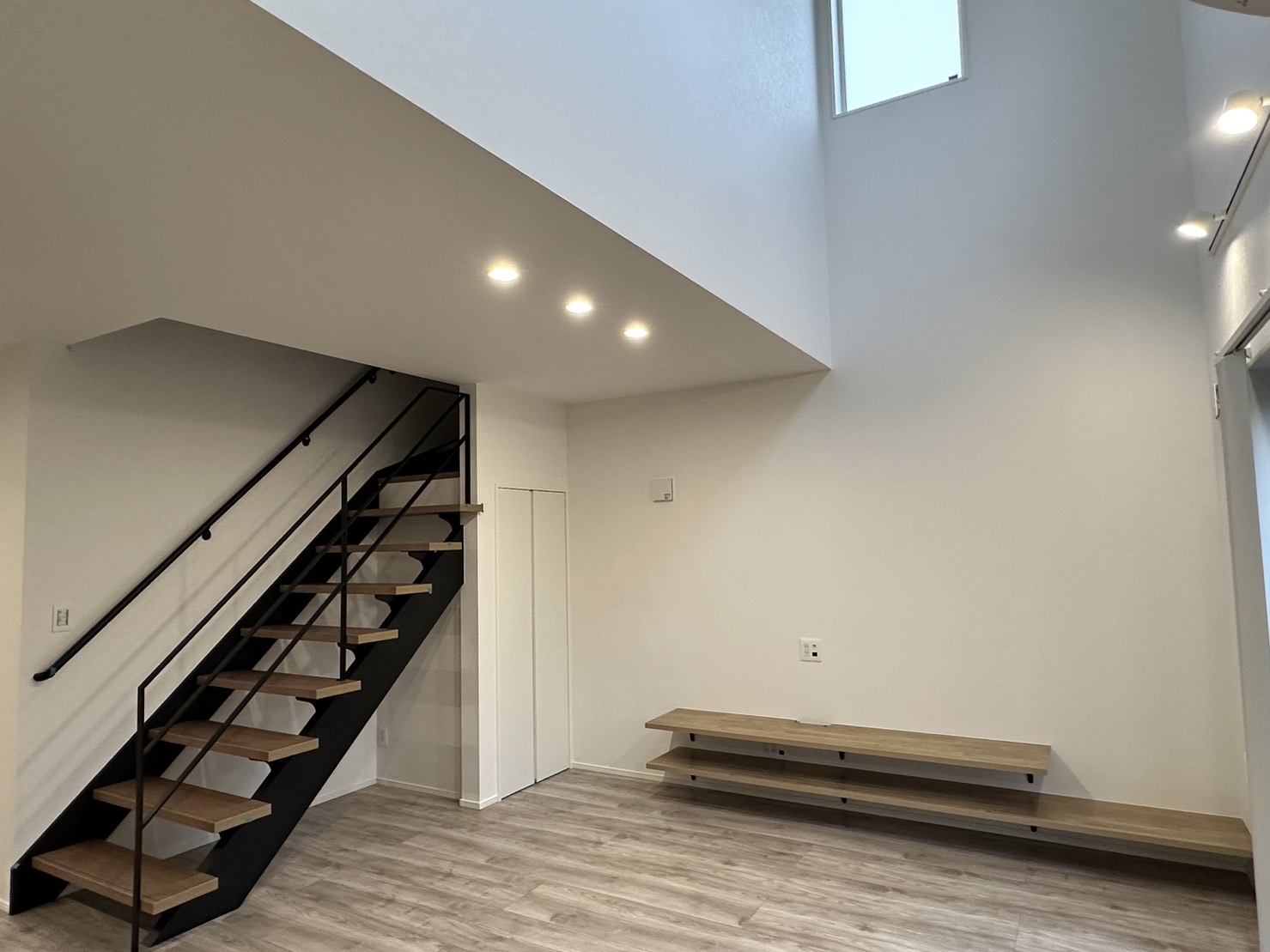③アイアン手摺のオープン階段と造作のテレビカウンターがリビングをオシャレに演出してくれます。また、リビング上部には明るい光が差し込む大きな吹抜があり、より空間を広く感じさせてくれます。