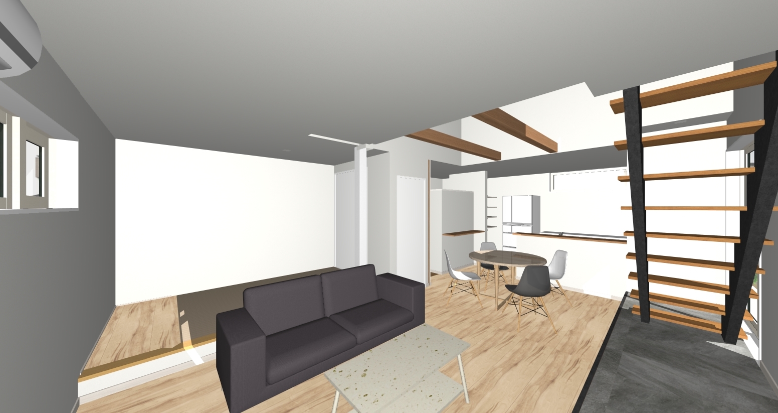 ・階段を昇る先には約6帖の広いスキップフロア。家族で楽しめるおうち映画館になっています。