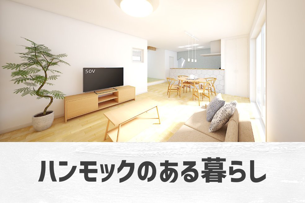 ・和室梁見せ天井から下がるハンモック、オシャレな格子付き屋内窓、キッチン腰壁デザインタイル、洗面所入口三角下り壁など、お施主様のこだわりが詰まっています。