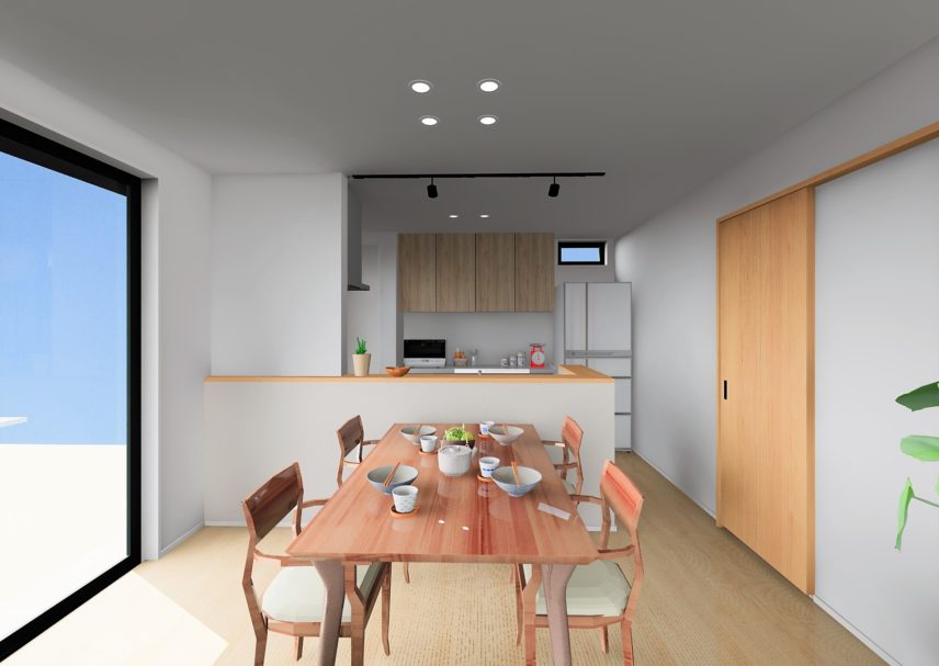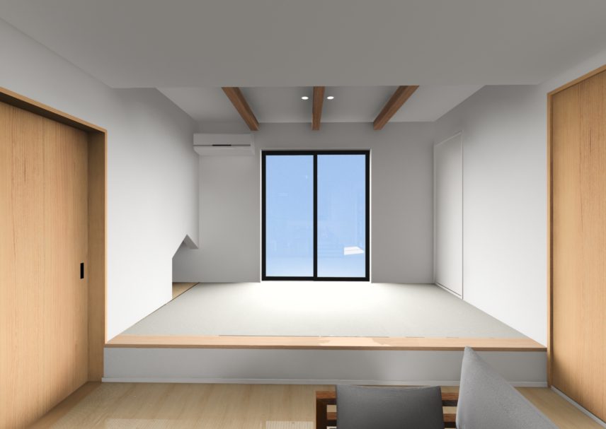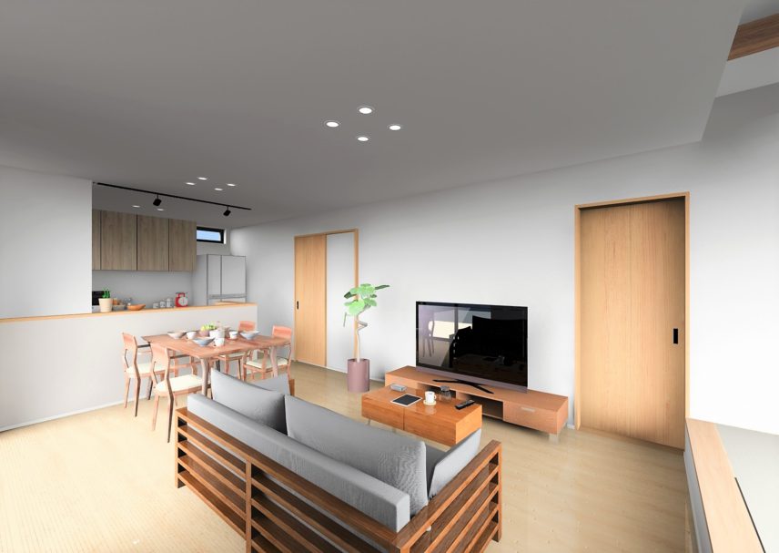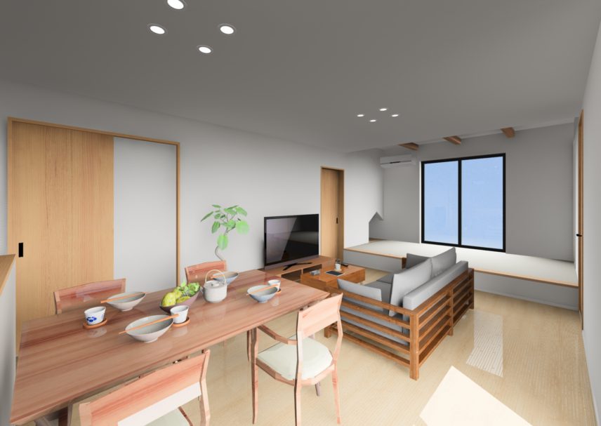 LDKの延長で小上がりタタミコーナーが広がり、外にはタイルテラスもあるので、開放的な空間に。