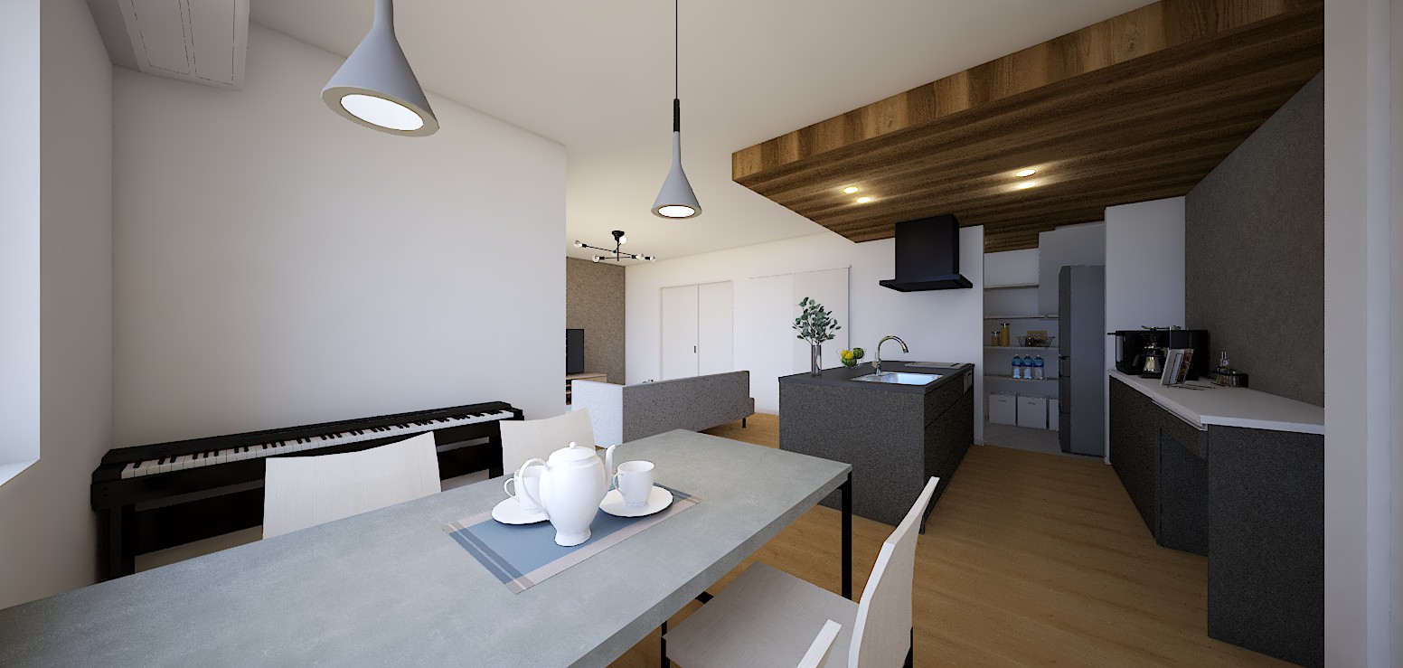 ✅折り下げ天井のキッチンにオシャレでハイグレードなペニンシュラキッチン、W=2700のカップボードに3帖の大容量のパントリー
