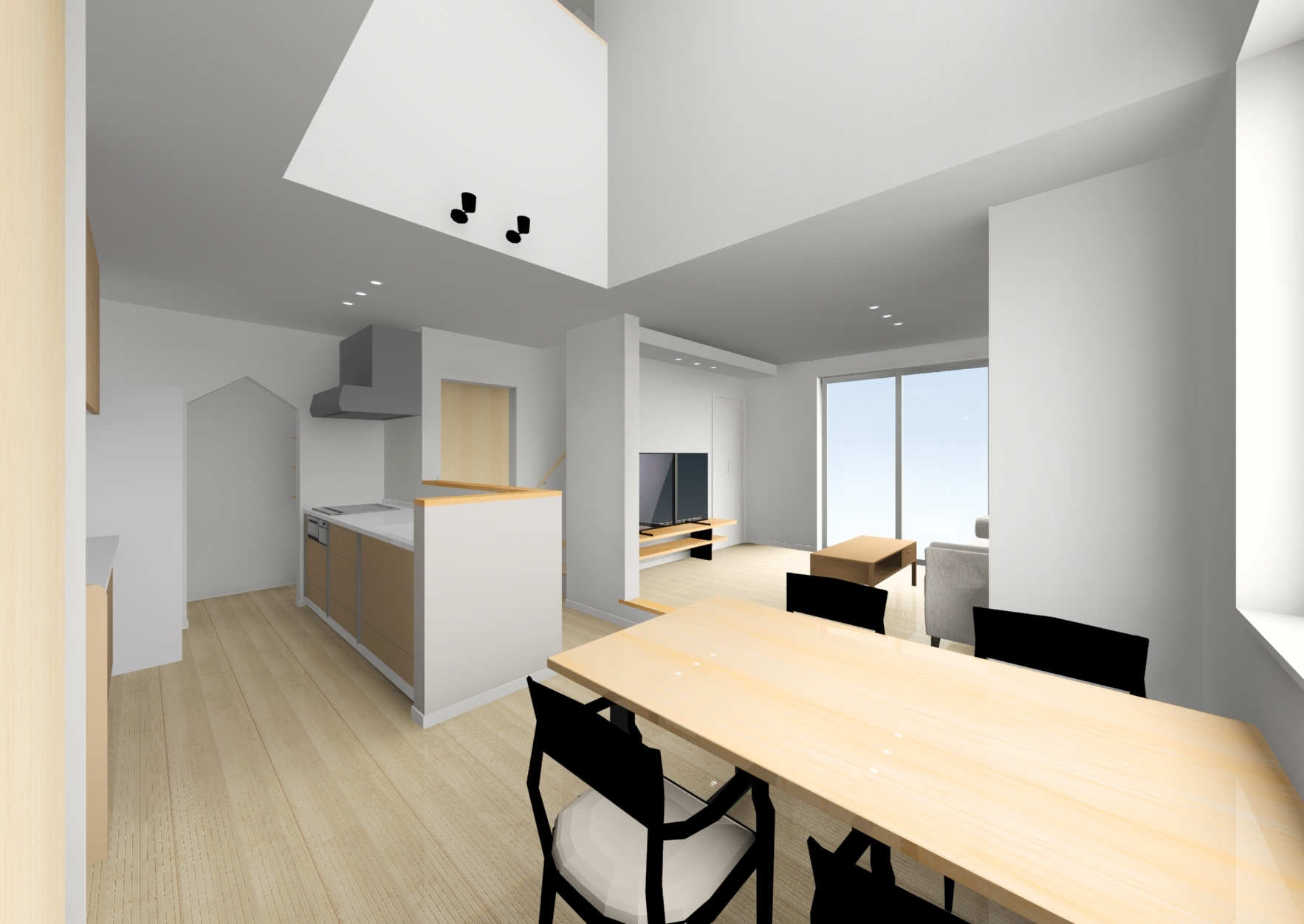 ダイニングの上部は吹抜けで開放的!キッチンからリビング、ダイニングを見渡せるので安心♪