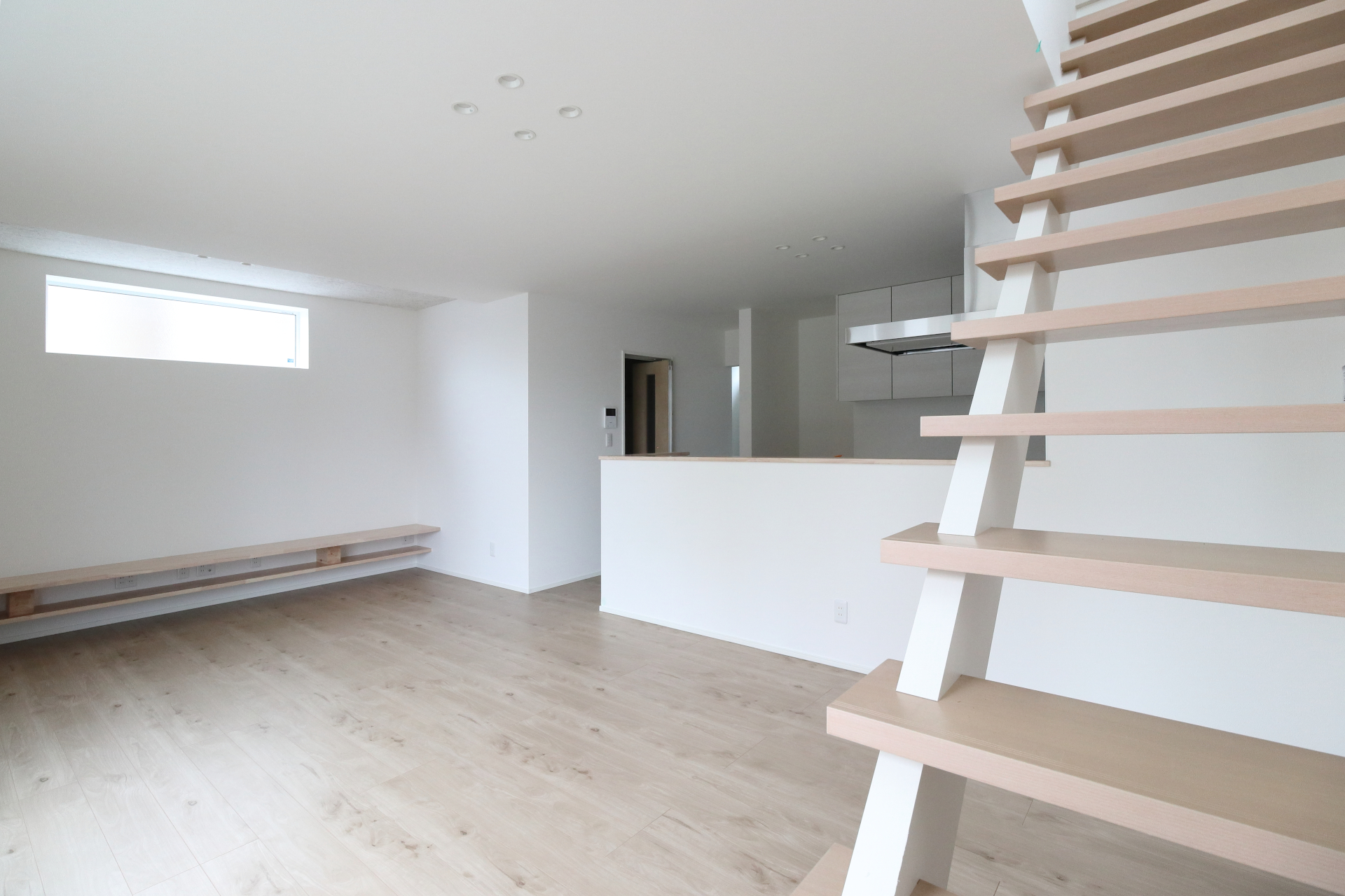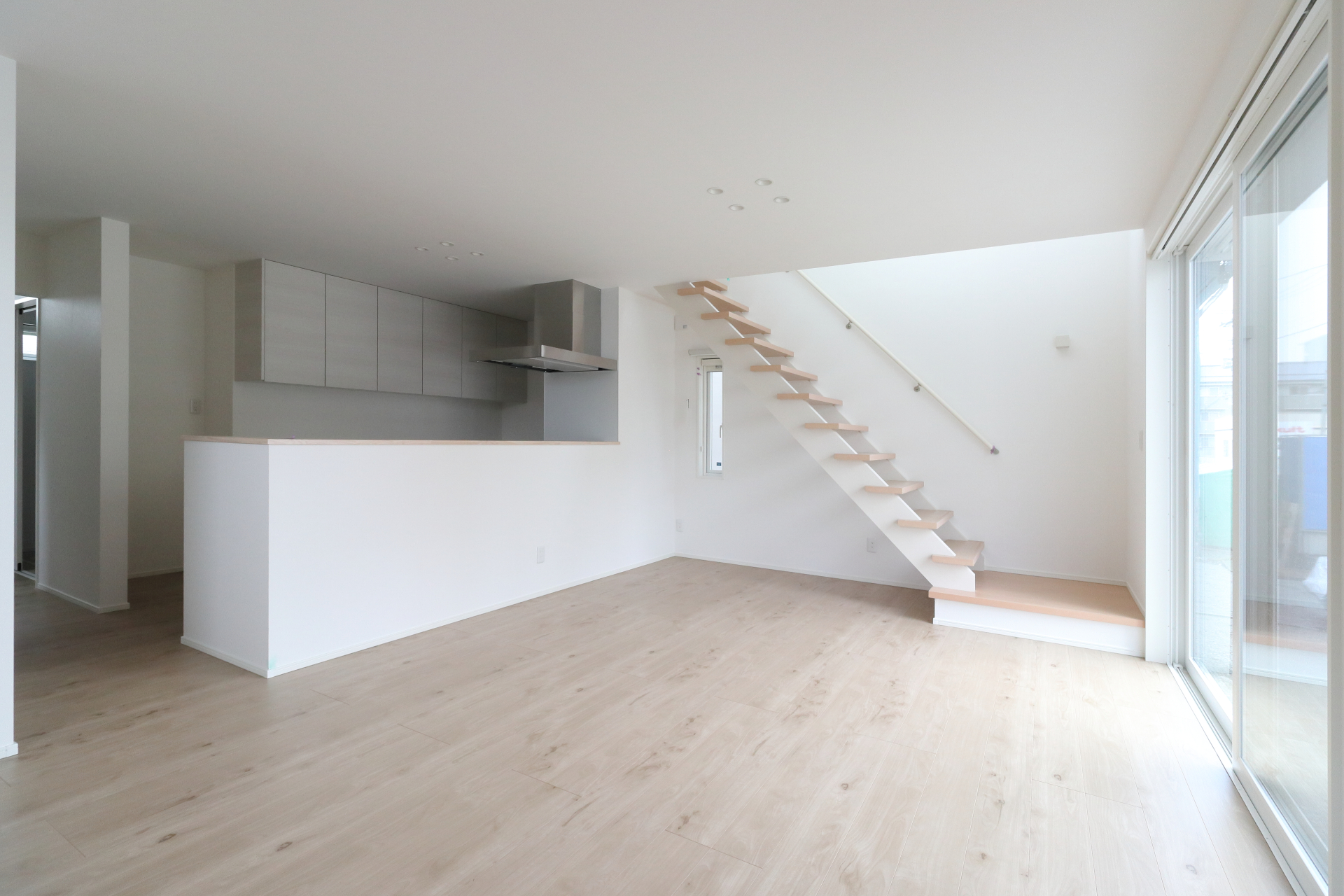 ナチュラルカラーのオープン階段で、開放的かつ温もりを感じる空間に。