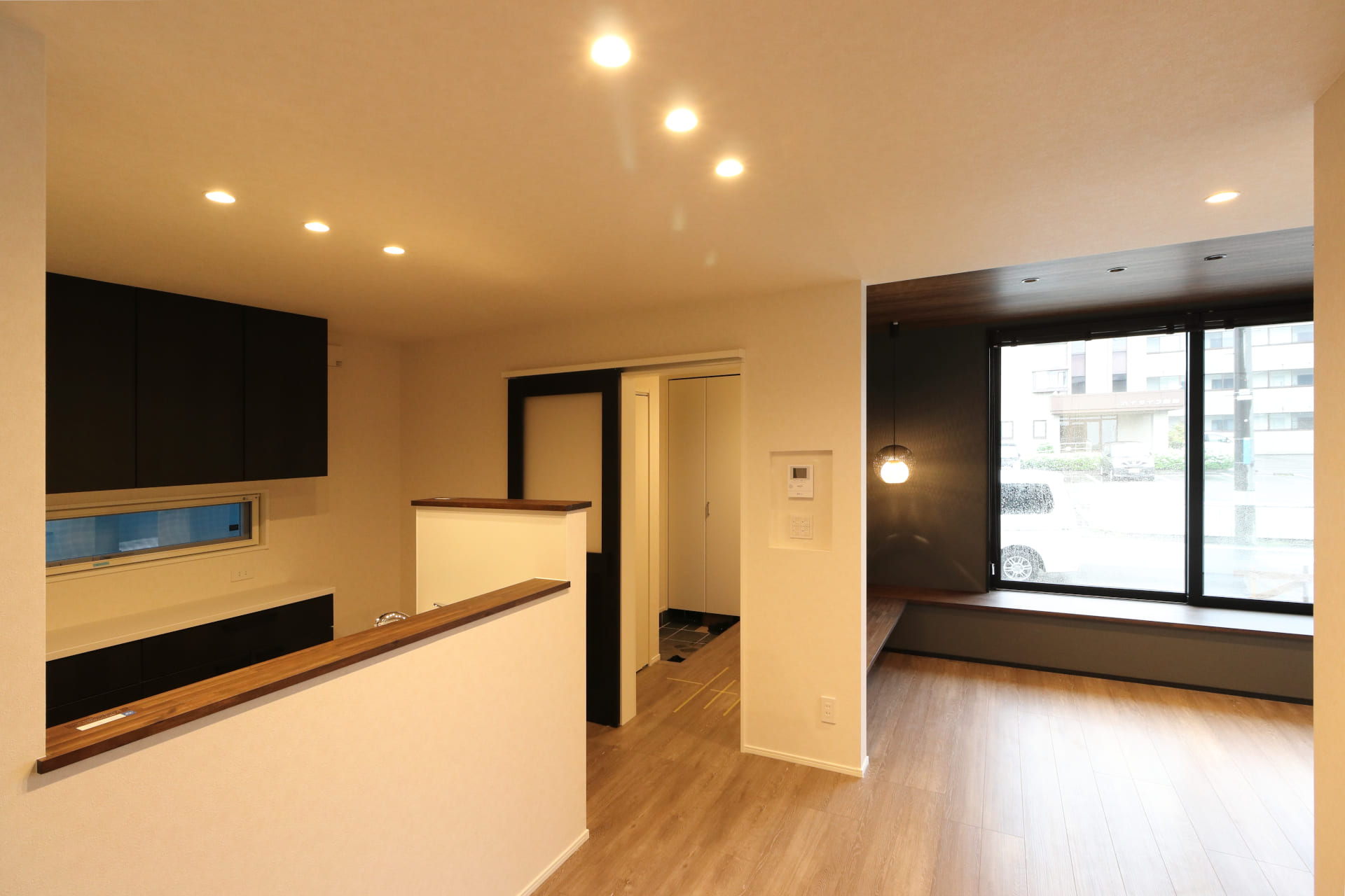 リビング・キッチン合わせて16帖のLDK。玄関側のキッチン壁を高くして、生活感を感じさせない設計。