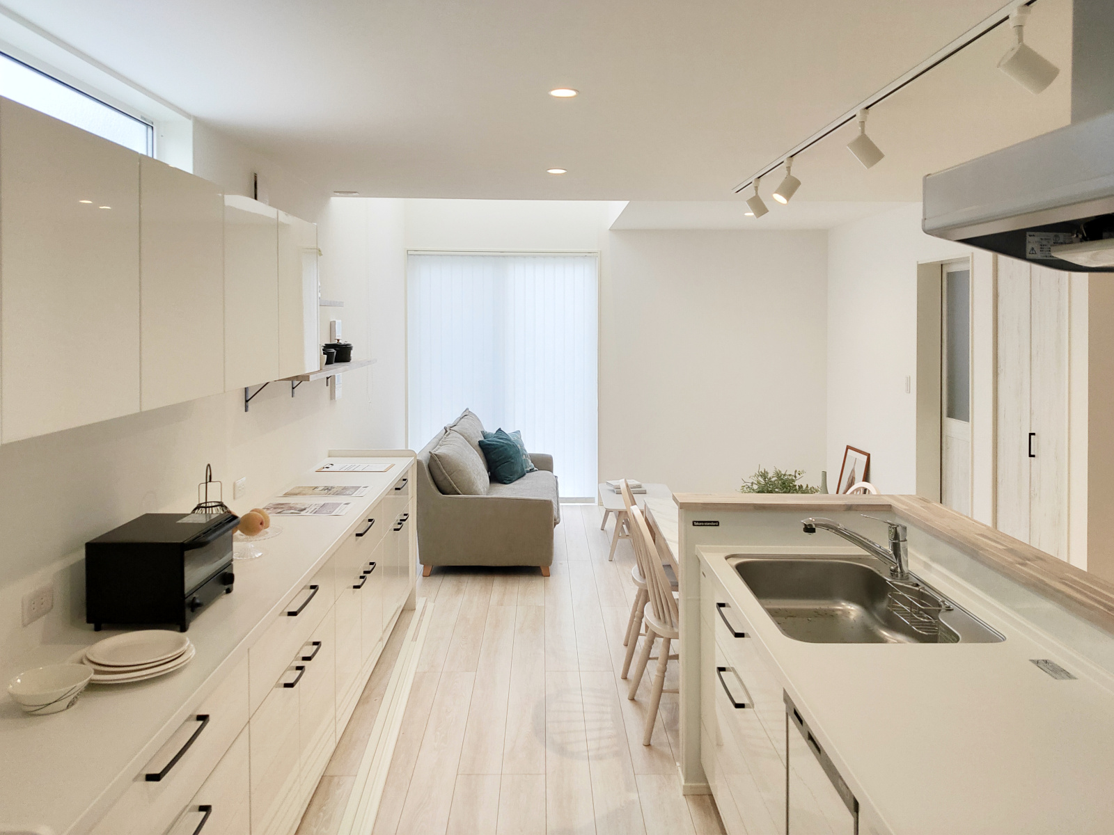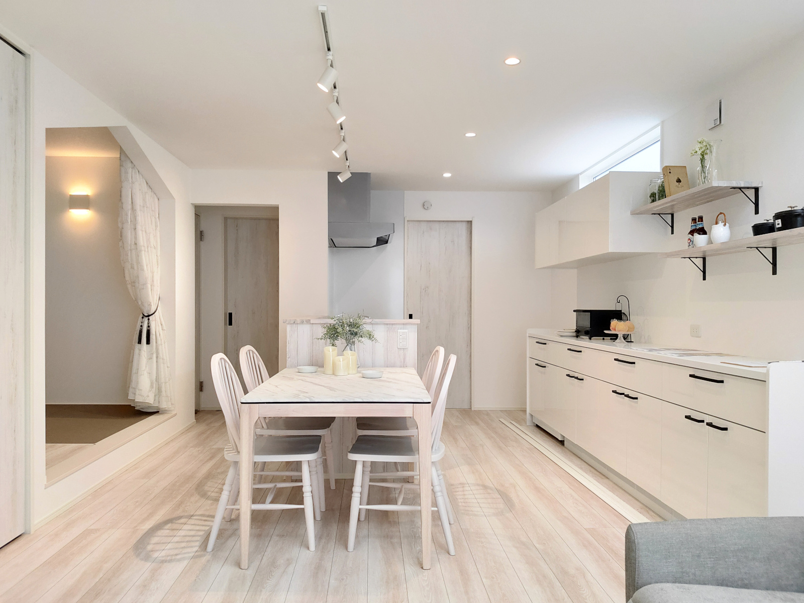 吹き抜けで開放的なリビングの家。くつろぎの多目的スペース「ヌック」あり。家具、カーテン付のトータルコーディネートされたモデルハウスのような建売住宅。