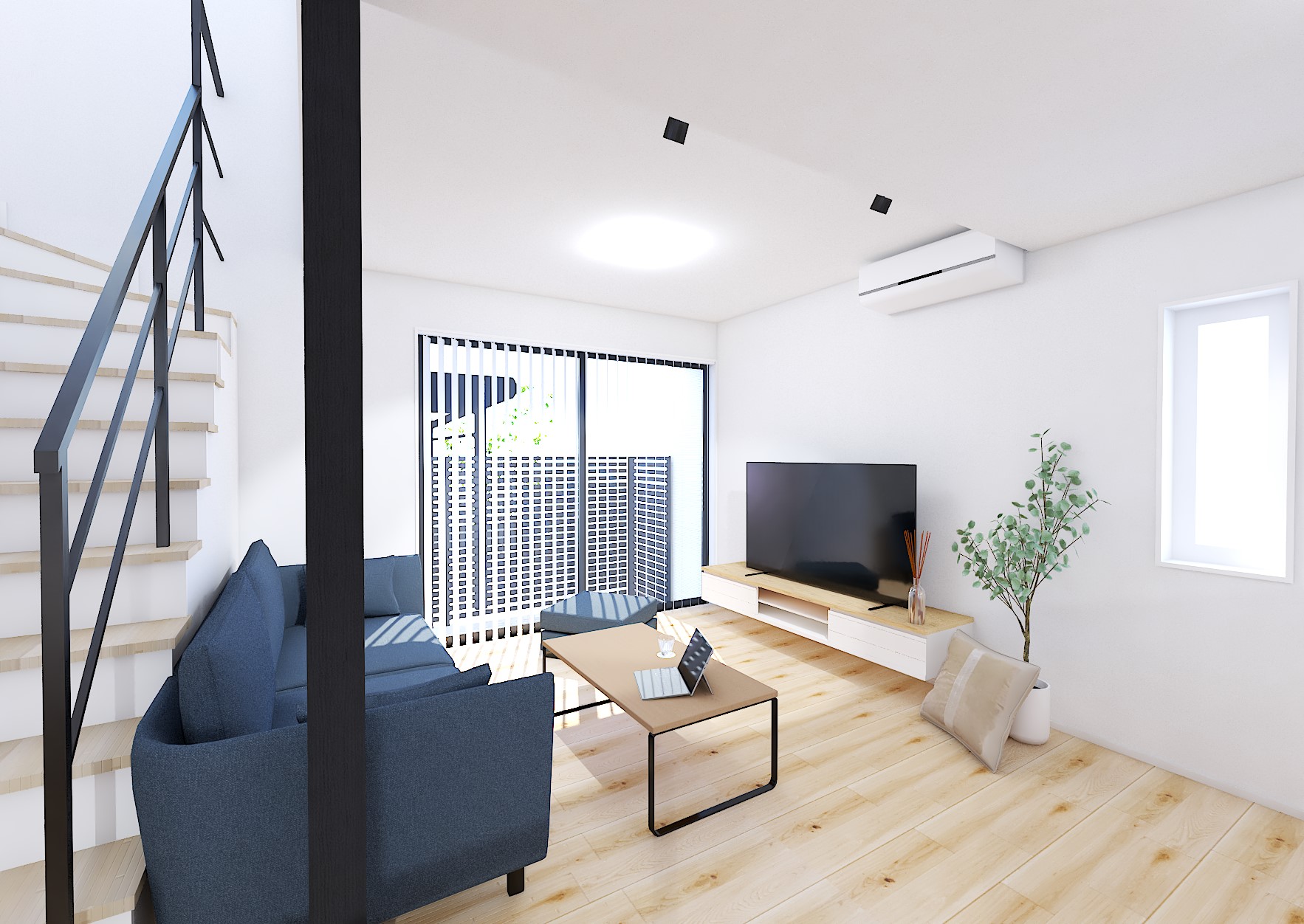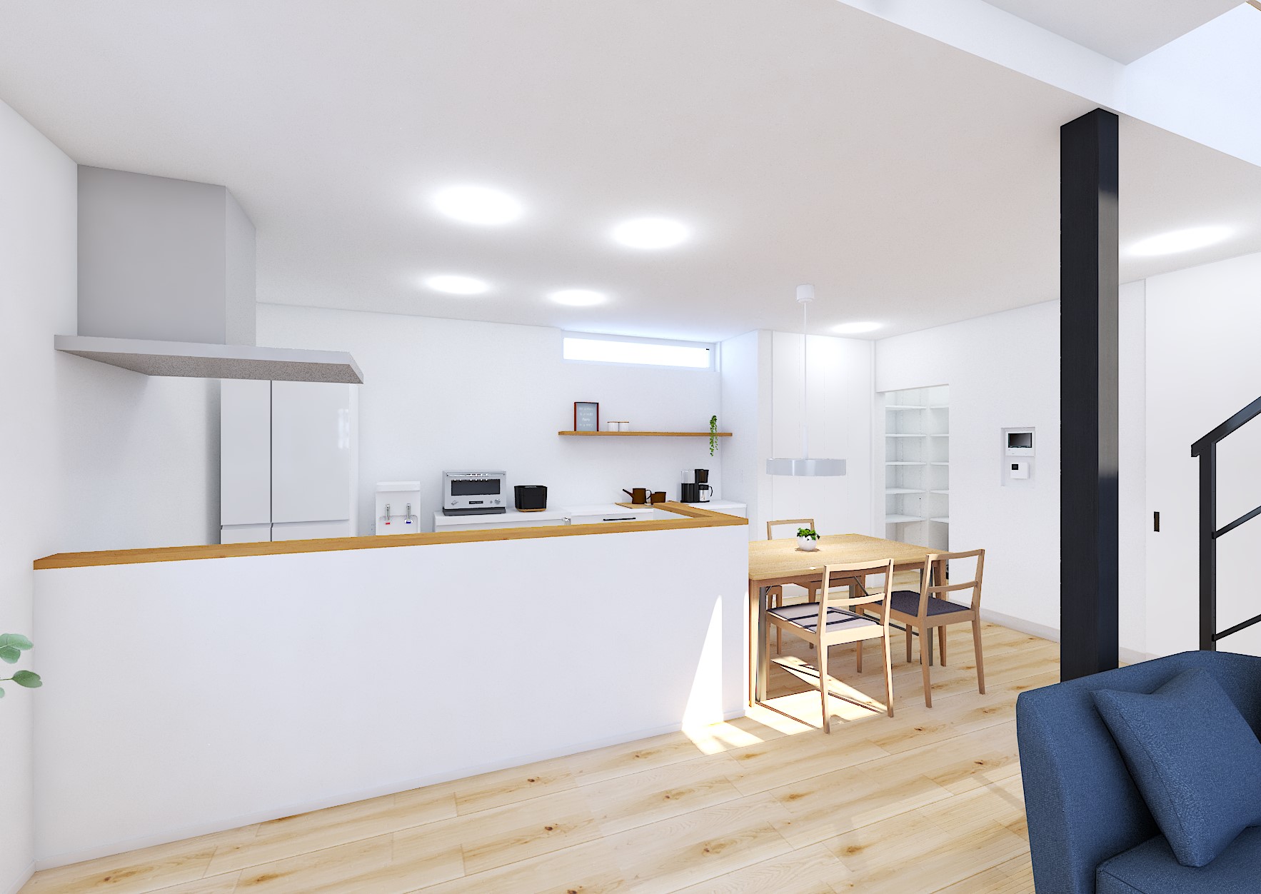 広々とした一体型のLDK、キッチンからリビング全体を見渡せるため、ご家族の一日の中での動きが見えて安心です。