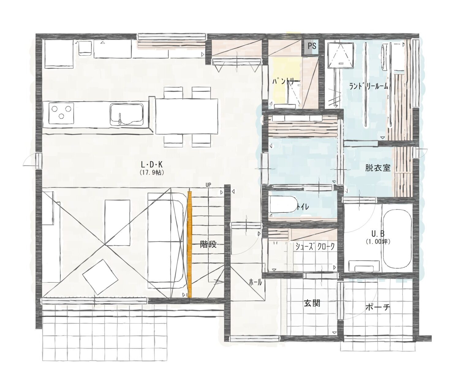 家事負担を軽減するために、水回り動線をまとめて配置。効率よく家事が行えストレスフリーな生活をサポート。
