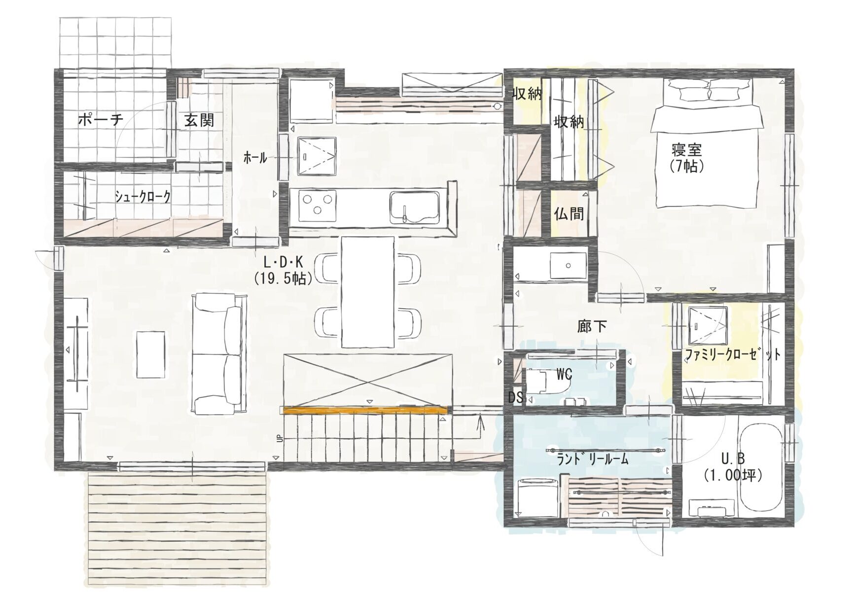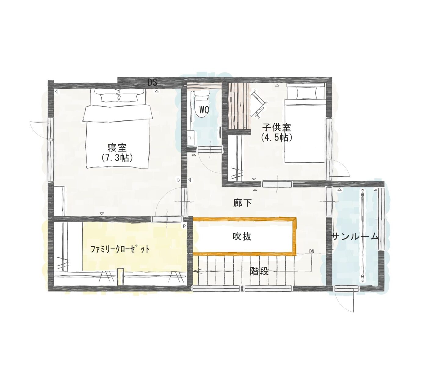 また、効率的に作業するために、ランドリールームとファミリークローゼットを近くに配置、「干す・畳む・しまう」の作業がスムーズに行え家事時短に繋がります。