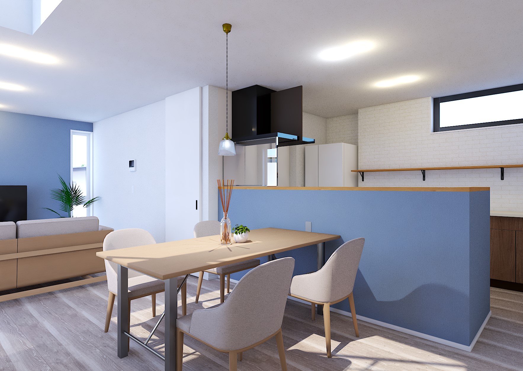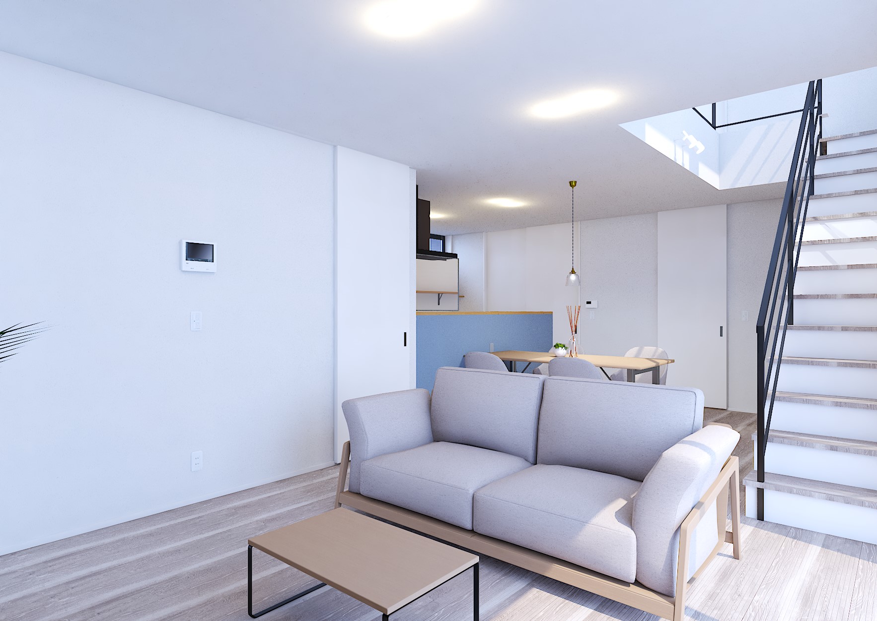 広々とした19帖のLDK、吹抜から差し込む光と外と繋がるウッドデッキで更に明るいリビングスペースを生み出します。