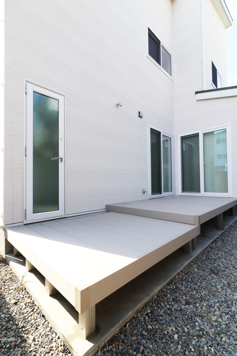 玄関からリビングへと繋がり、ドッグランとしても使えるウッドデッキ