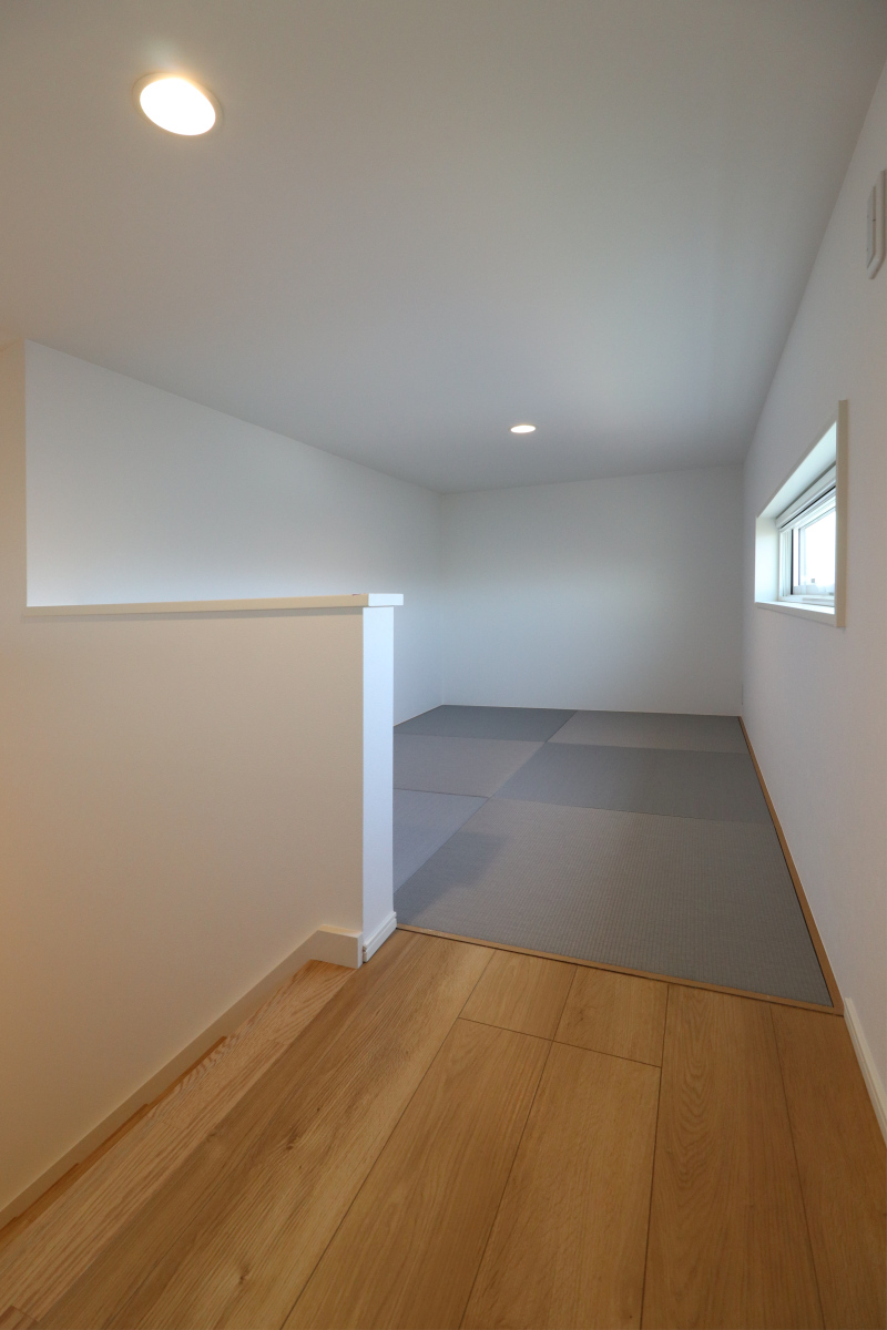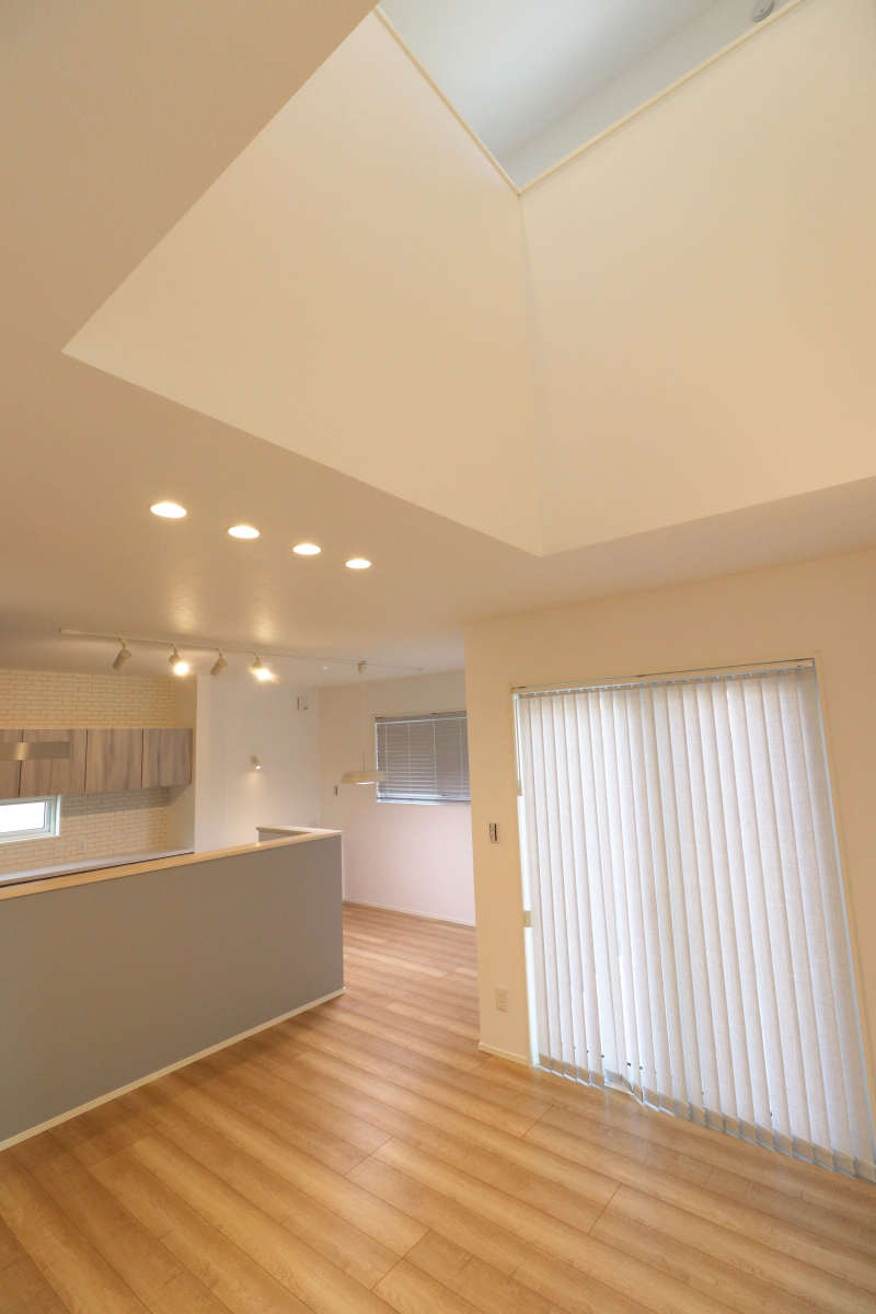 吹き抜けのある開放的な17.5帖のリビング、フローリングと畳の2タイプの空間で色々使える小屋裏収納、