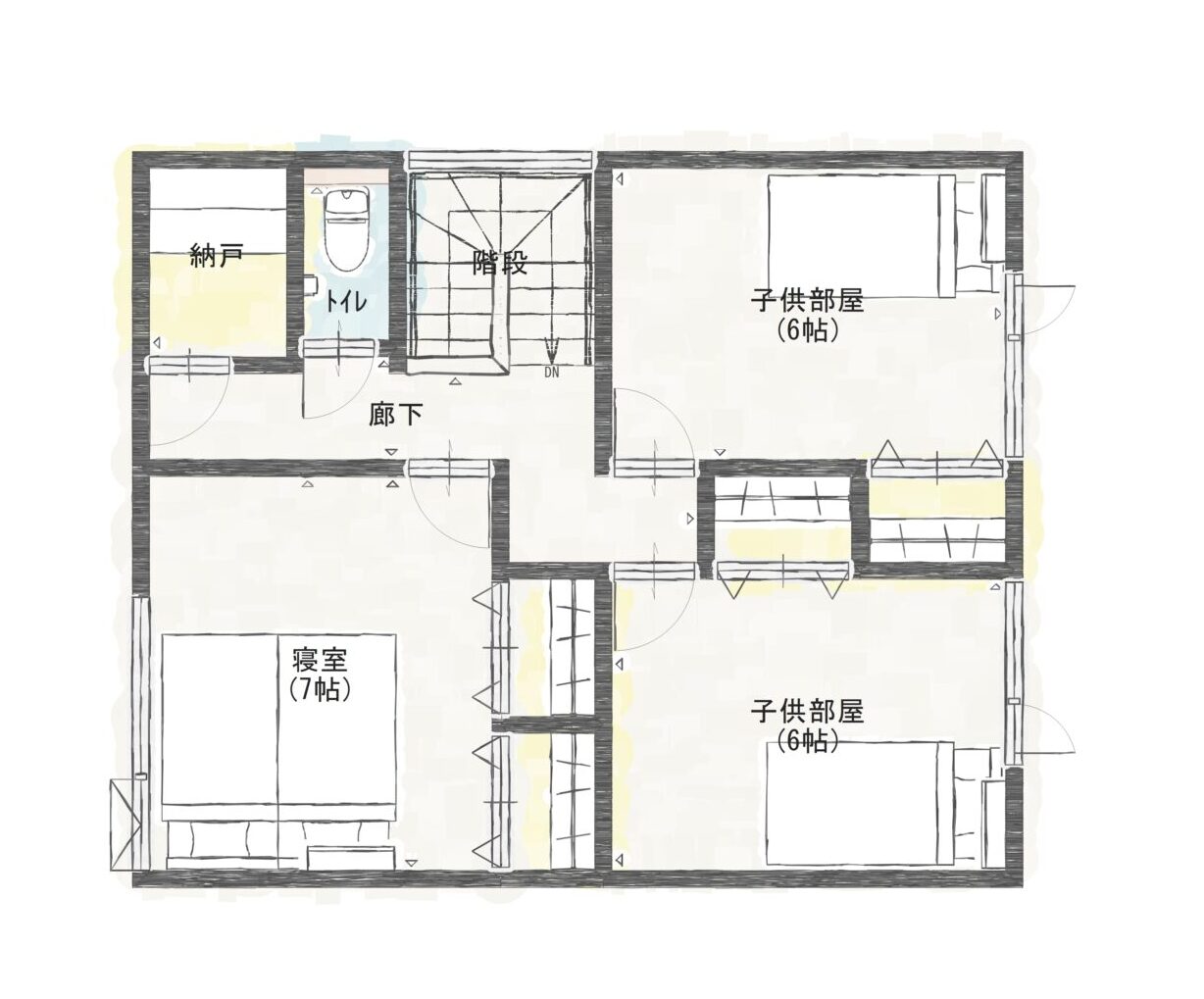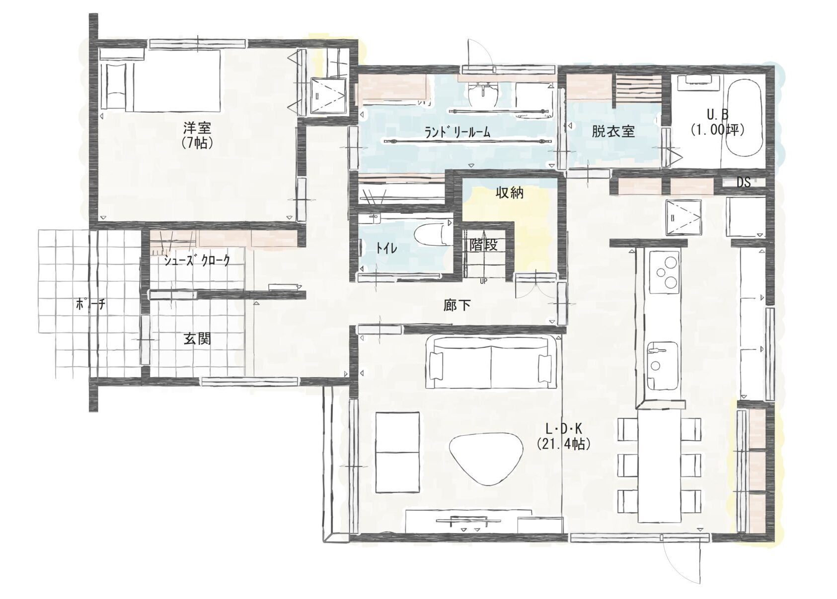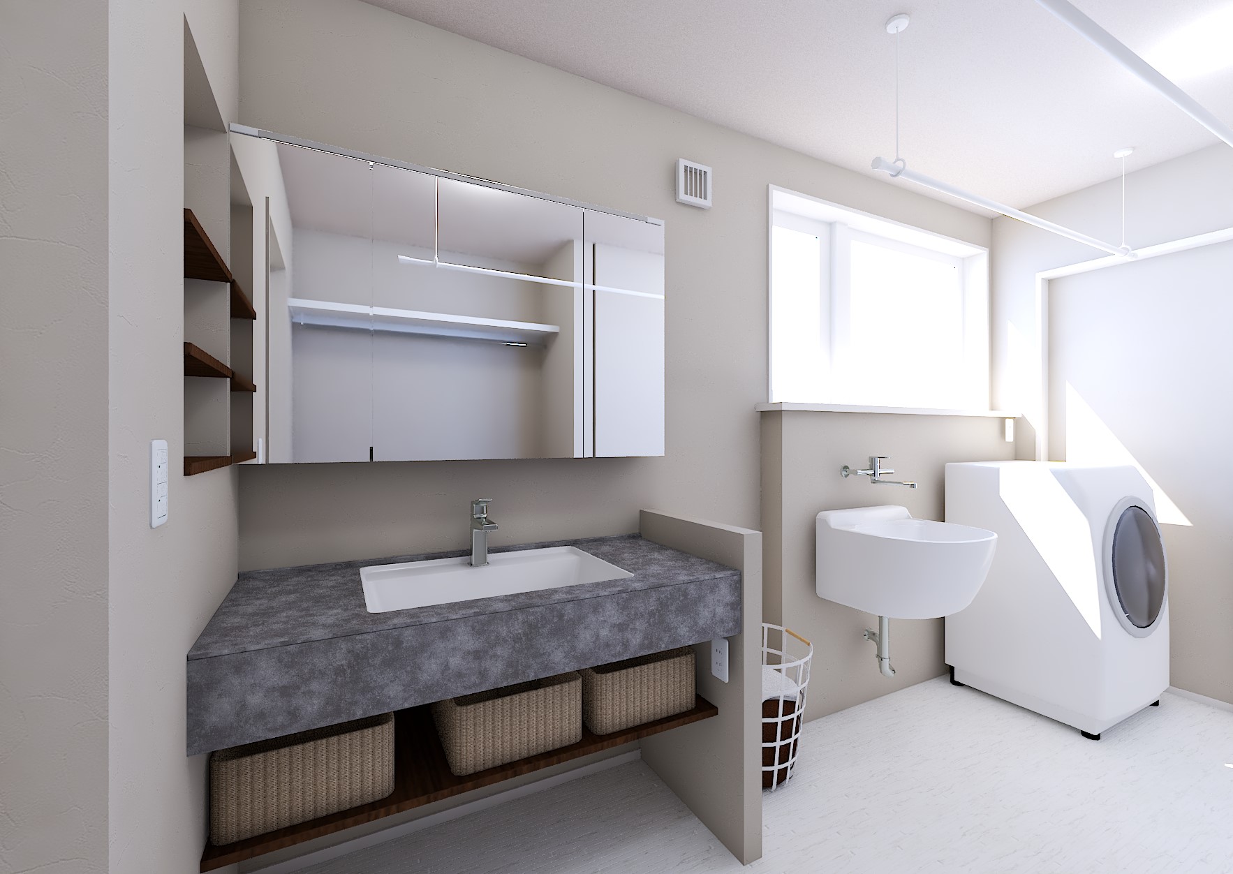 玄関を入るとすぐに広々としたシューズクロークがあり、靴やコートなどを収納できます。各所に回遊動線を設けているので、行き止まりがなくスムーズに移動が可能。子育て世代には嬉しい、水回りの家事動線も効率よく工夫しているので、子育て中の家事も安心◎機能的で居心地の良い空間のお住まいです。