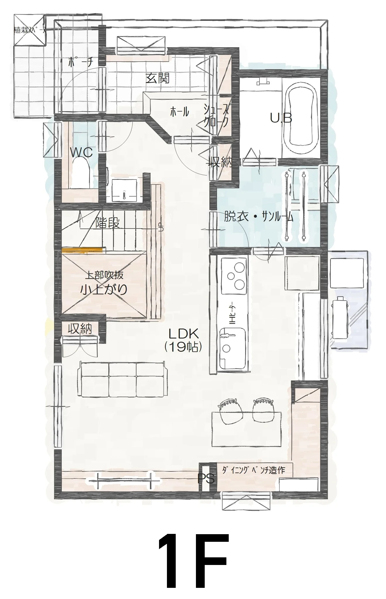 階段横に設置した小上がりスペースはお子様の遊び場やお昼寝用スペース、洗濯物を畳んだりなど活用できます。