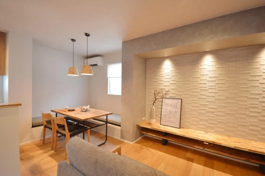 ダイニングのスペースを有効利用してL字型にベンチを造作、大人数でも囲める空間に仕上げました。