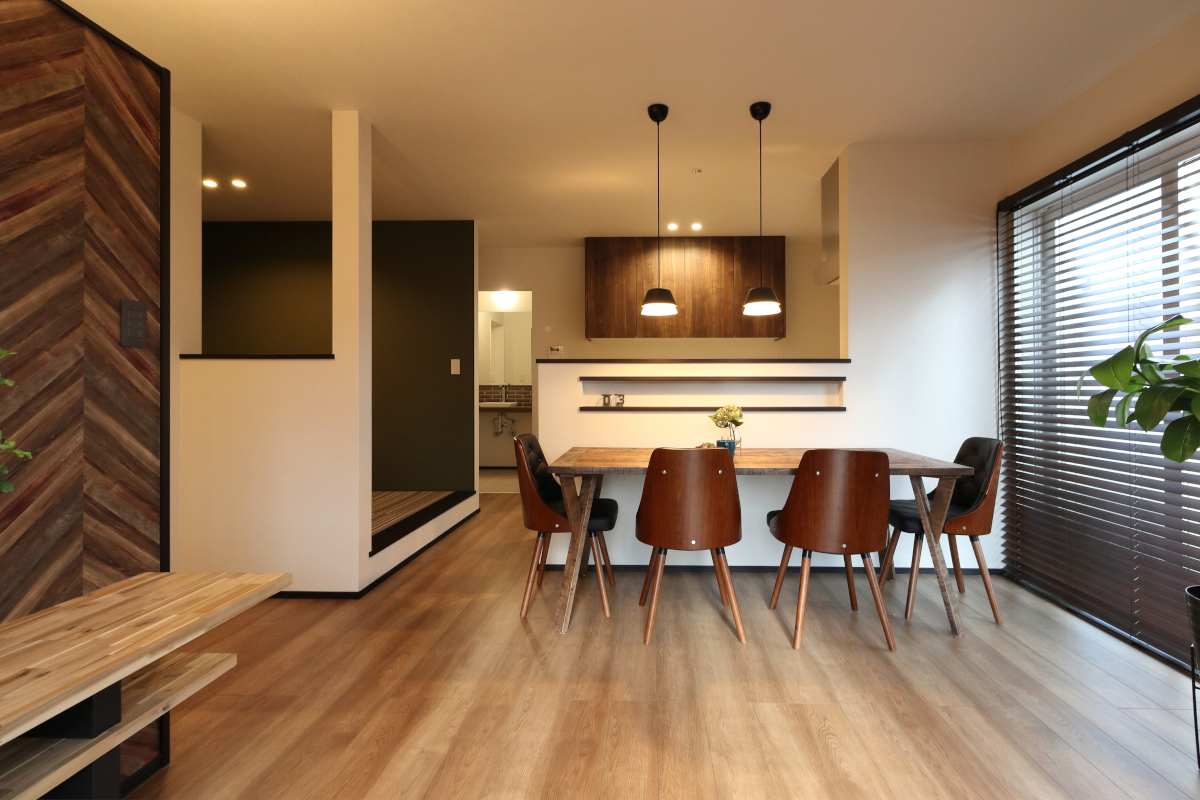 8.7帖分の大空間小屋裏収納付きの家。シースルーのリビング階段は圧迫感を感じさせず、のびのび過ごせるリビングに。ガーデニングなどを気軽に楽しめるウッドデッキ付き。キッチン隣にパントリー(食品庫)があり、スッキリ片付け可能。