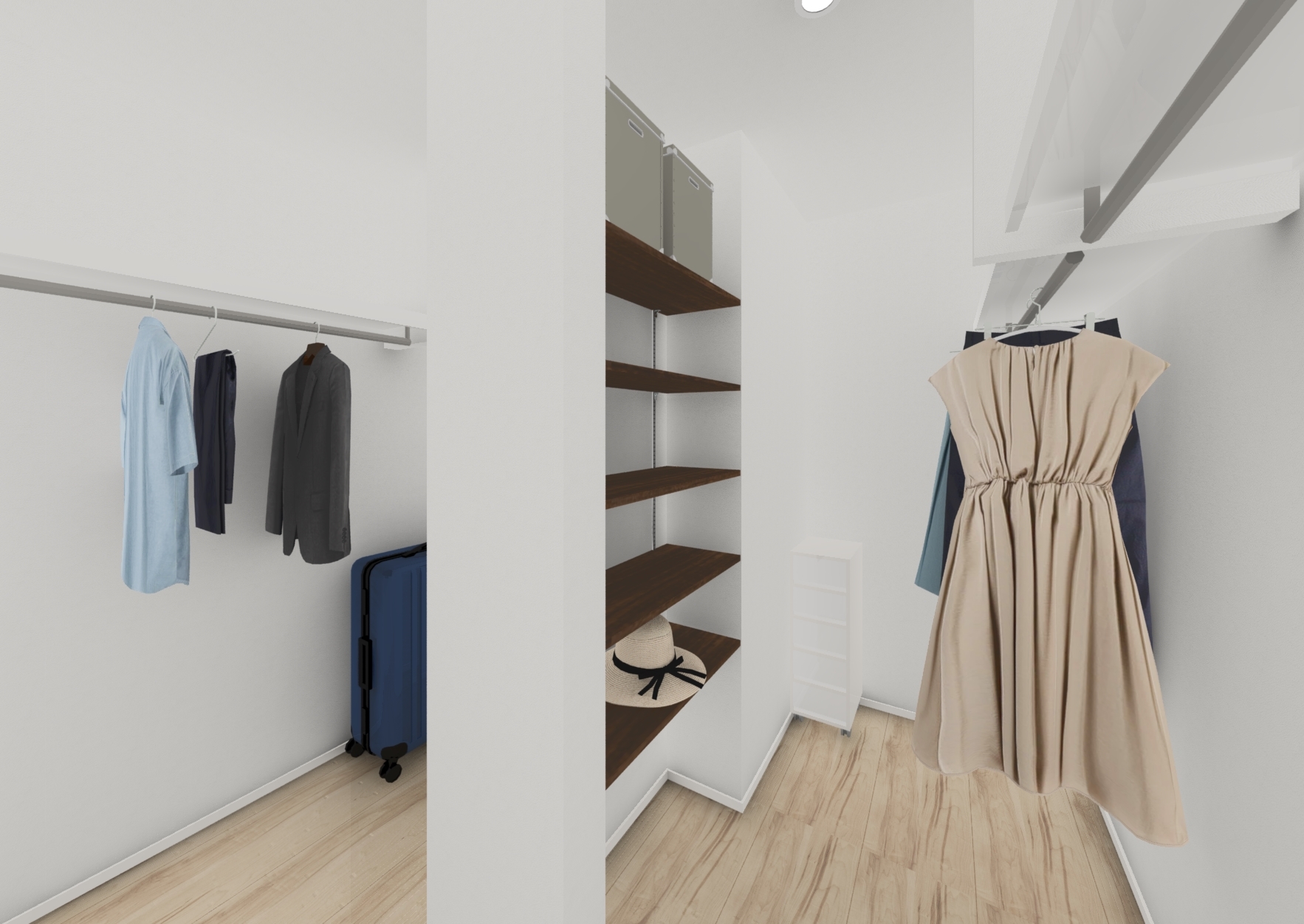 寝室に隣接した大容量のウォークインクローゼット。2つに分かれているので、家族で使い分けが可能。
