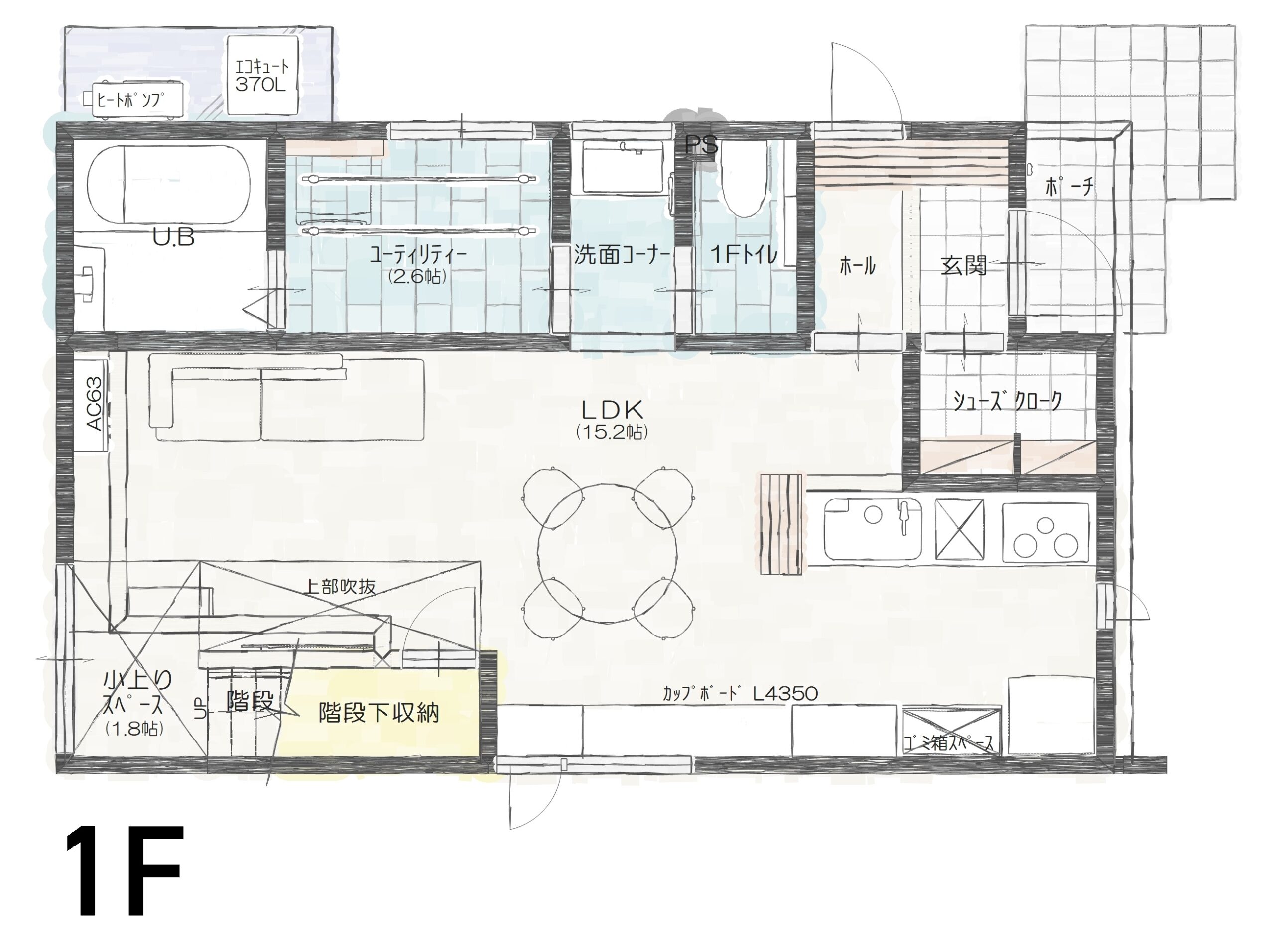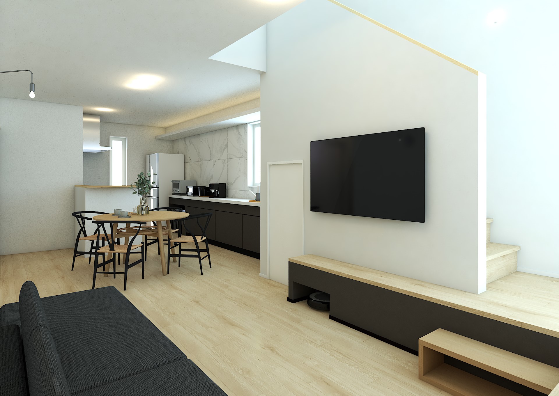 小上がり上部には吹き抜けを設けることで、リビングに立体感を生み出し、さらに魅力が引き立てられます。