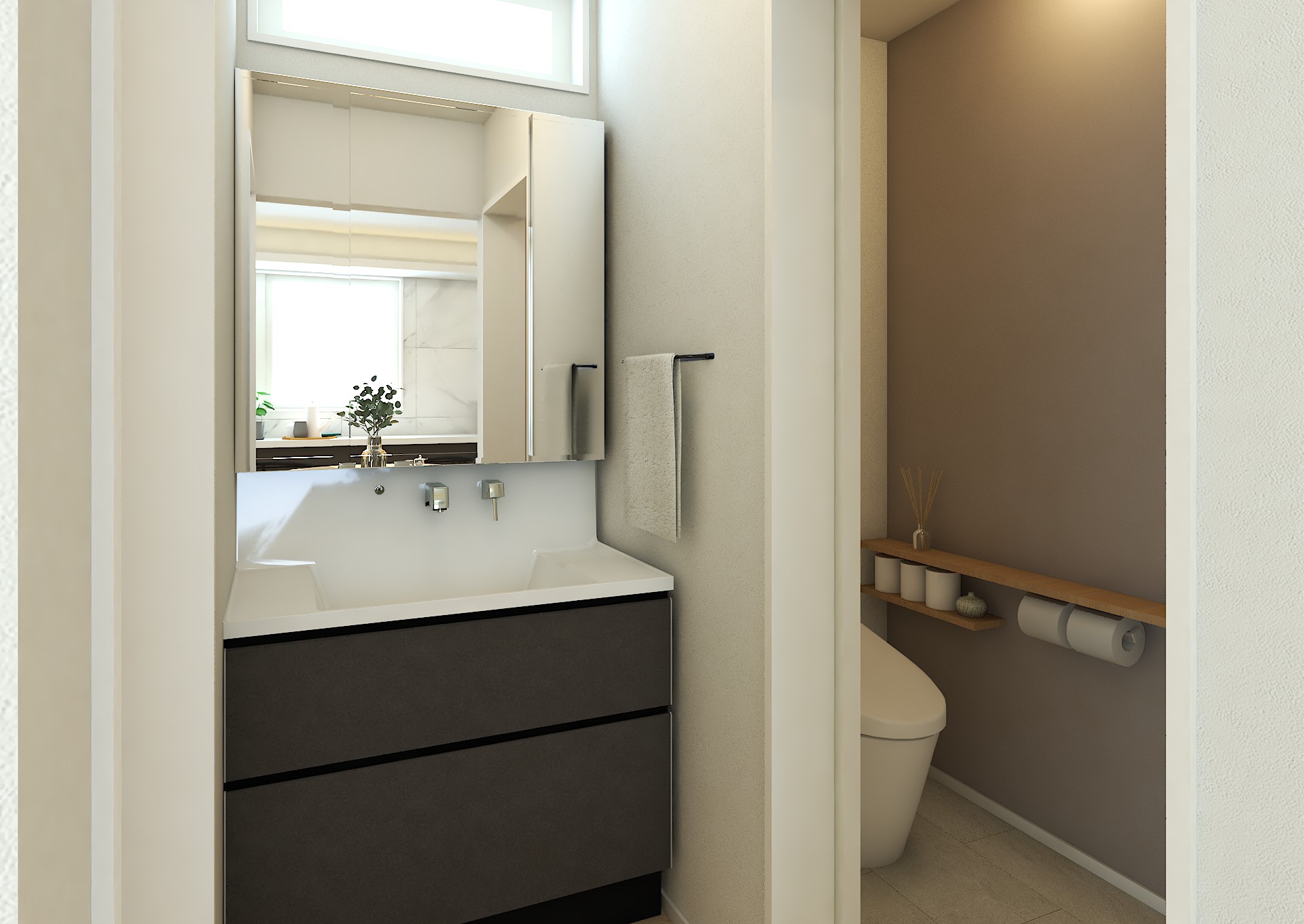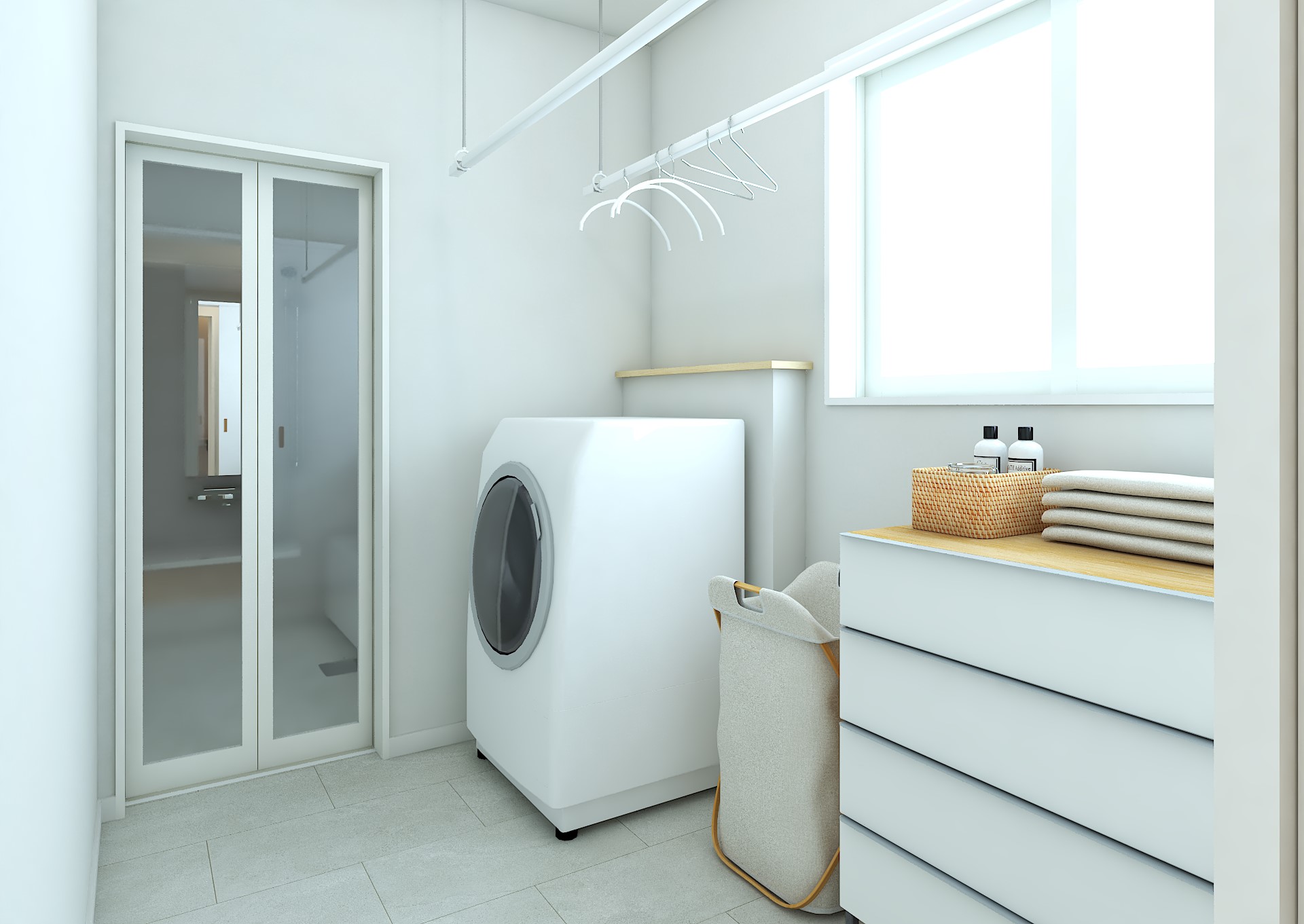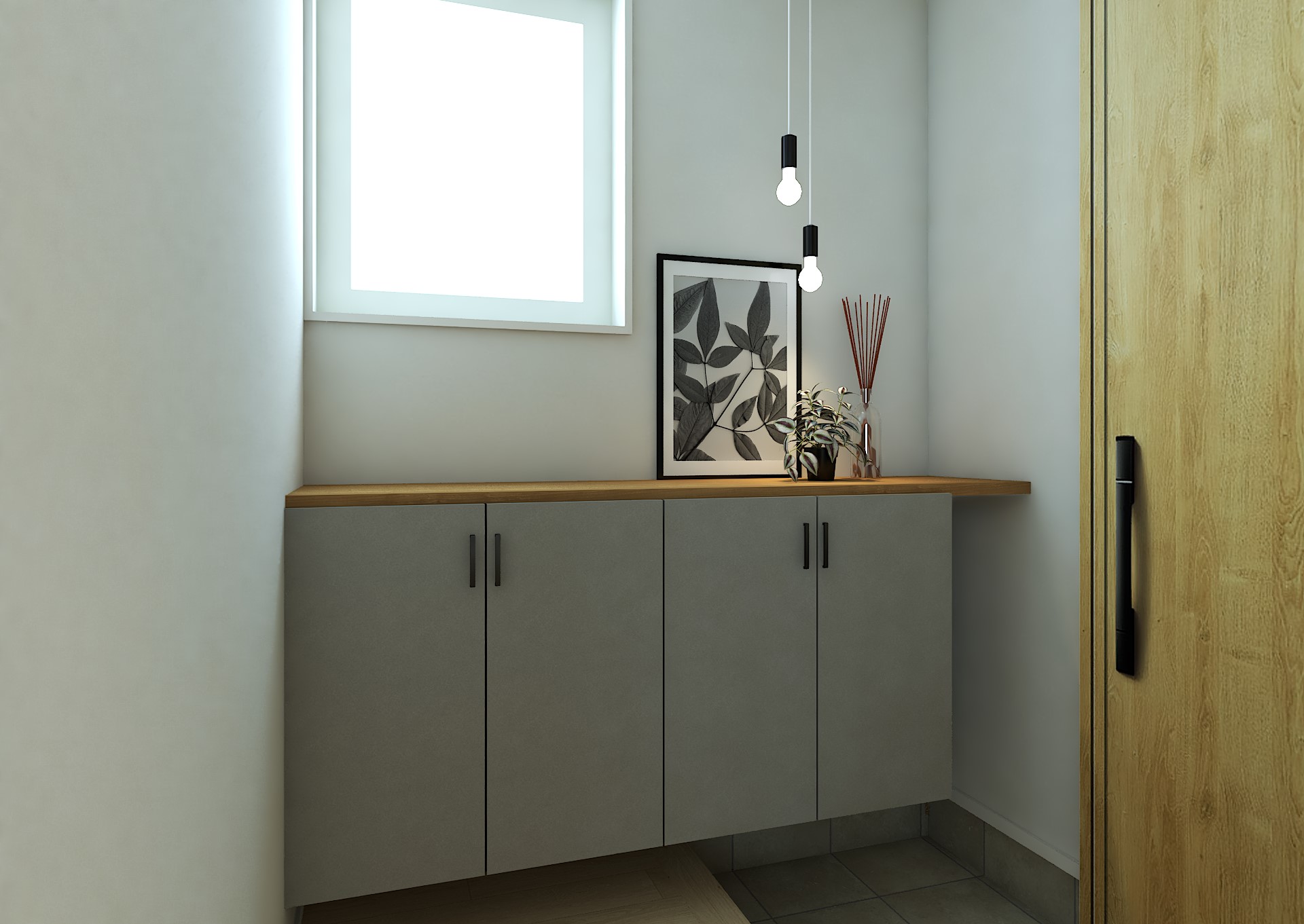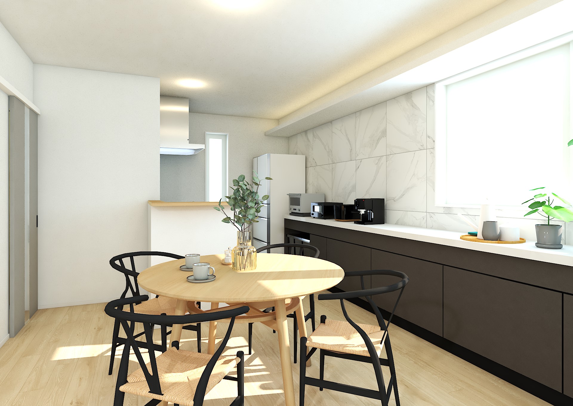 また、キッチンには吊戸のないローボードのみの収納を採用し、約4.3mの大容量カップボードでスッキリと収納が可能です。