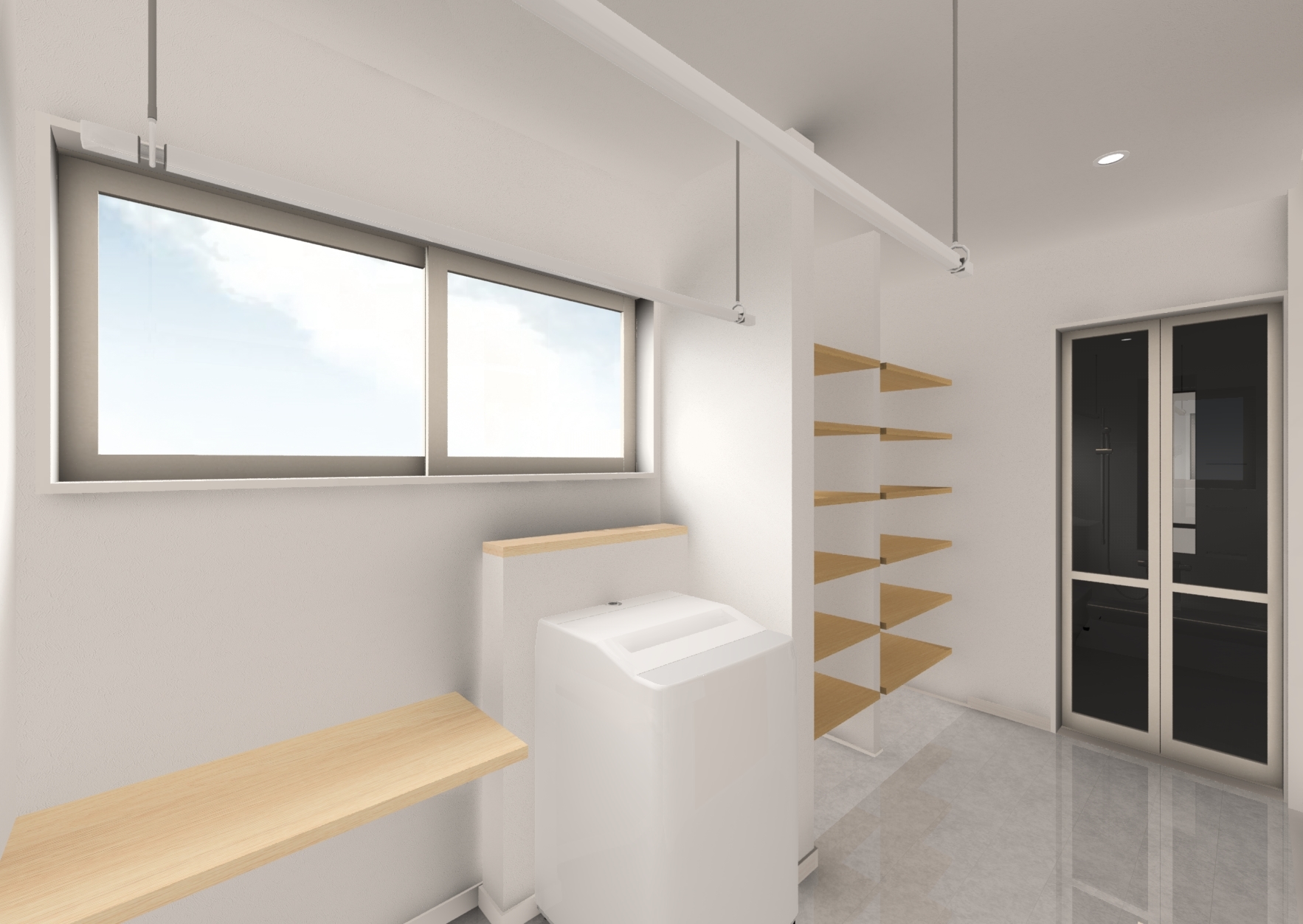 大容量の収納がある脱衣室兼サンルーム。*イメージパース
