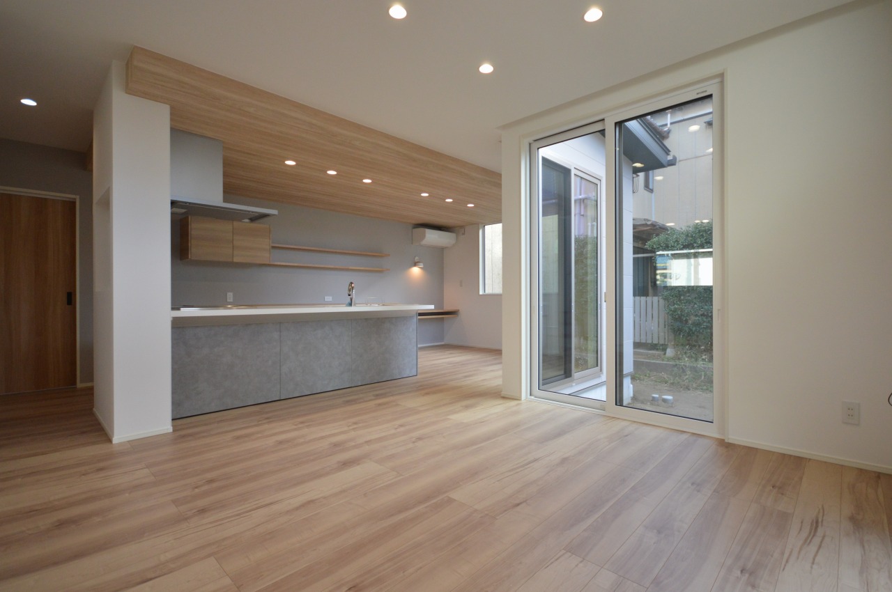 キッチンがインテリアになるLDK。*実際の写真