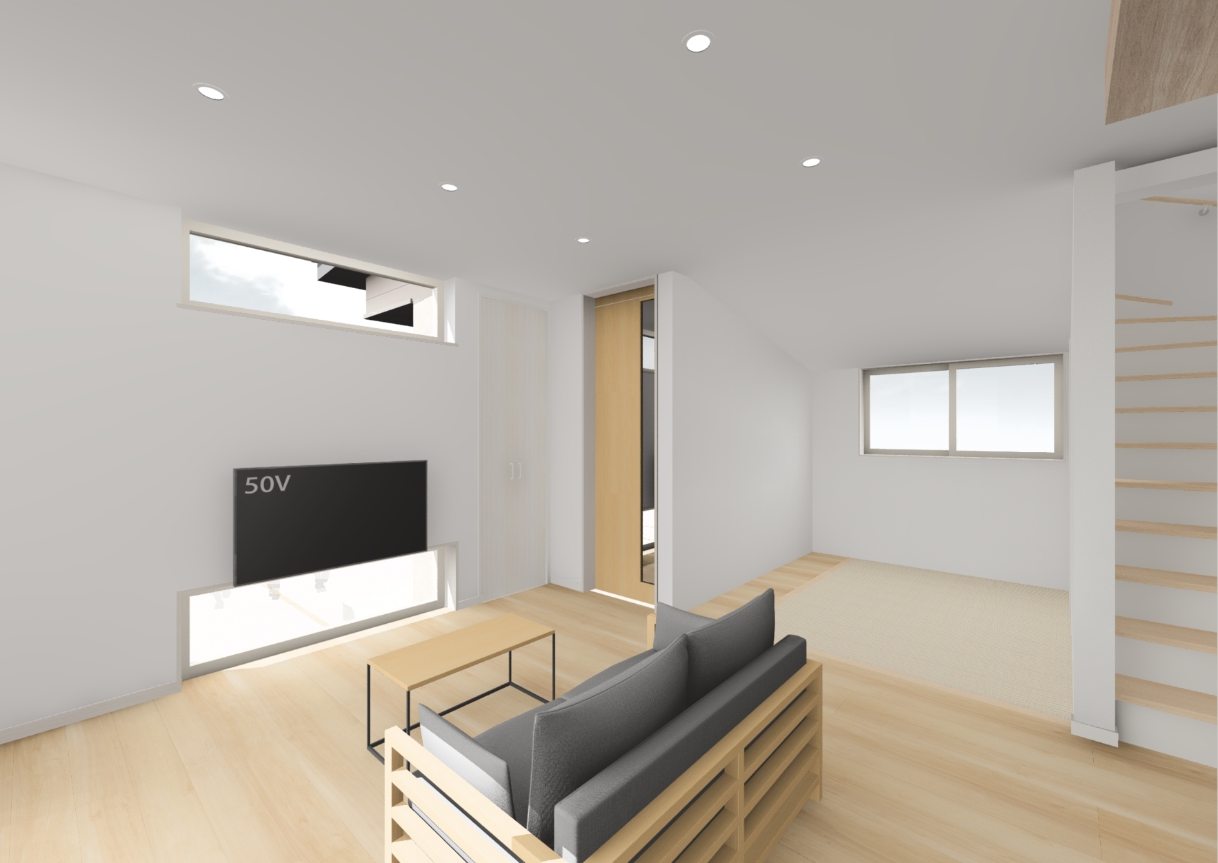 勾配天井の和室が開放された、リビング空間。*イメージパース