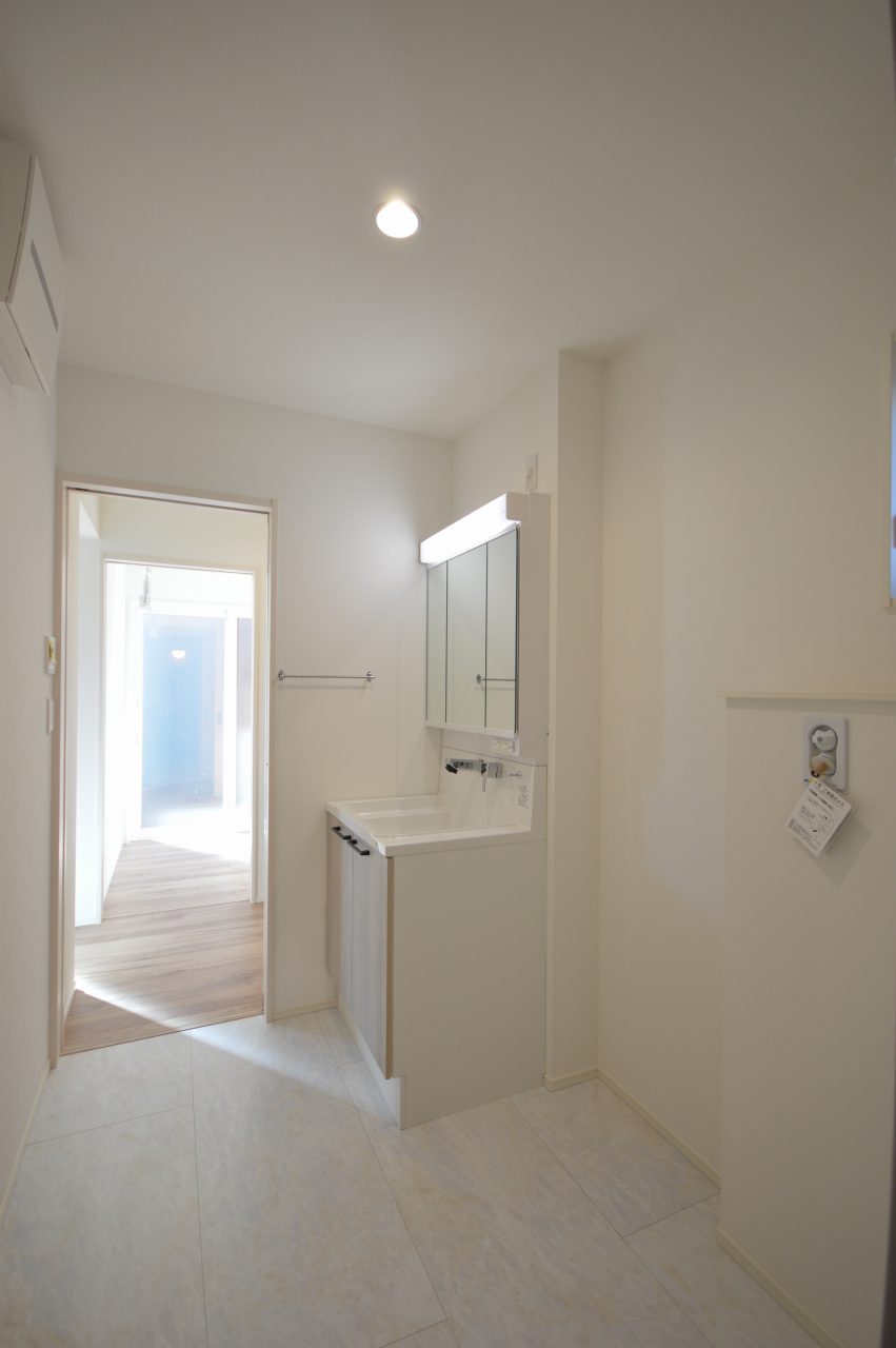 サンルーム左←家事スペース→洗面脱衣→浴室と一直線に繋がる水回り。