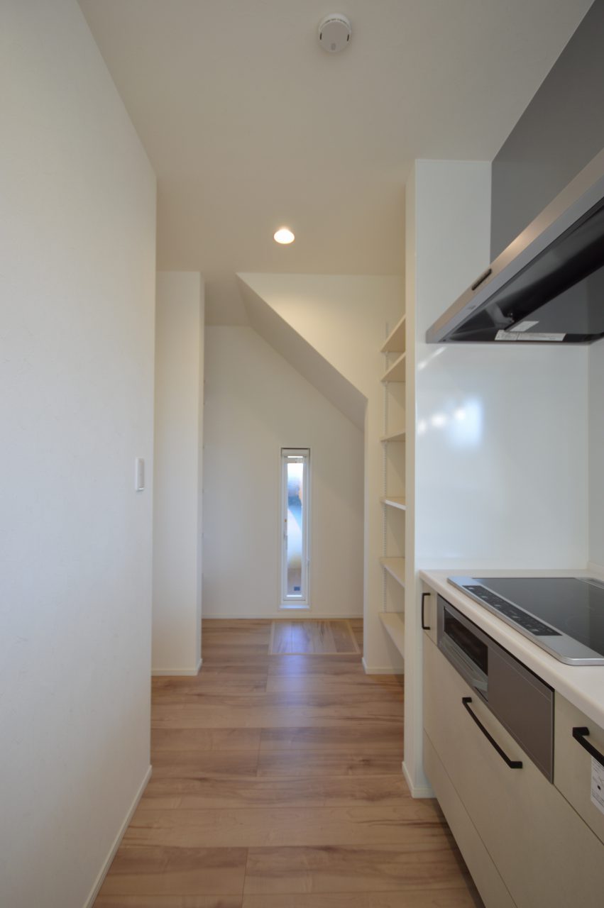 キッチン回りは食品庫に冷蔵庫を隠せる仕様、階段下収納を合わせて構成したので大容量のパントリーに。