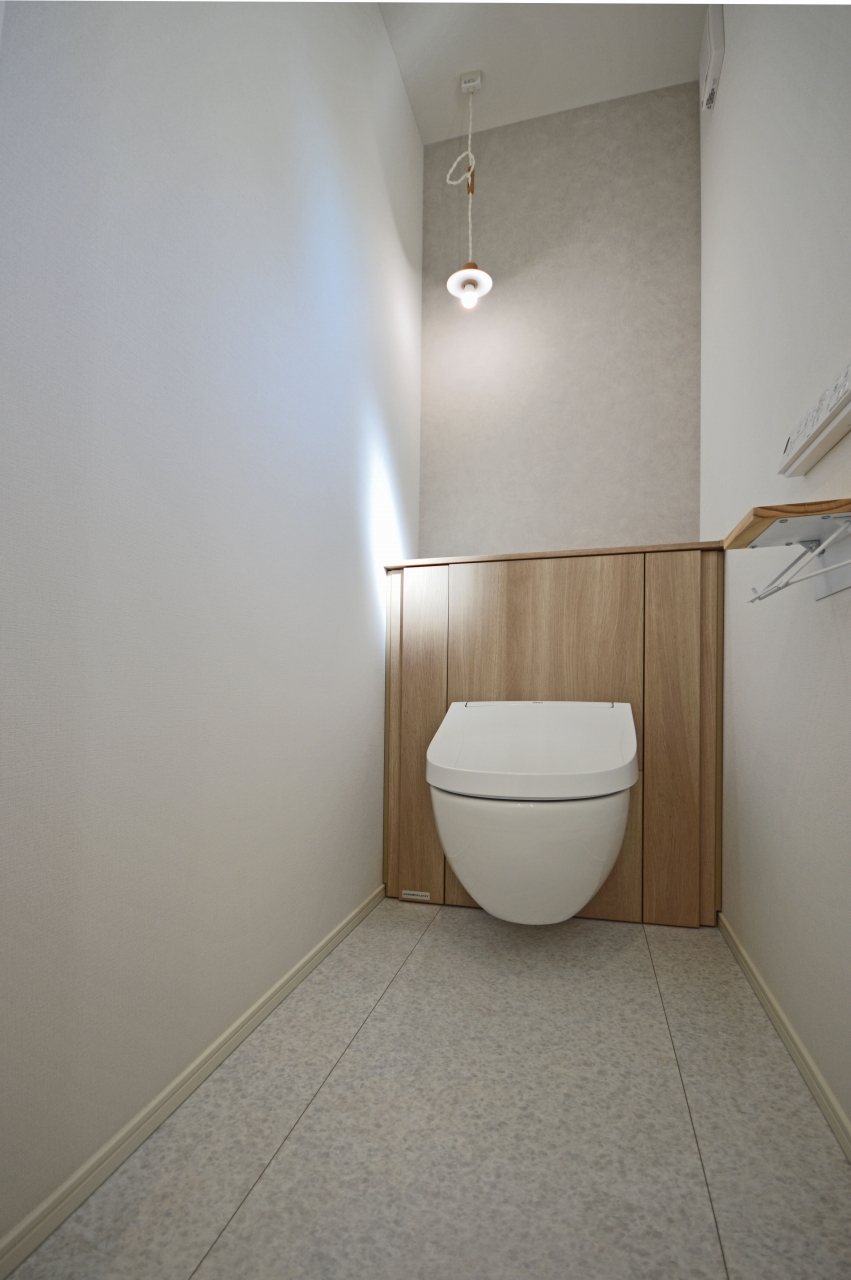 1階のトイレはお掃除を重視し、便器が床から浮いているフロートトイレを採用。