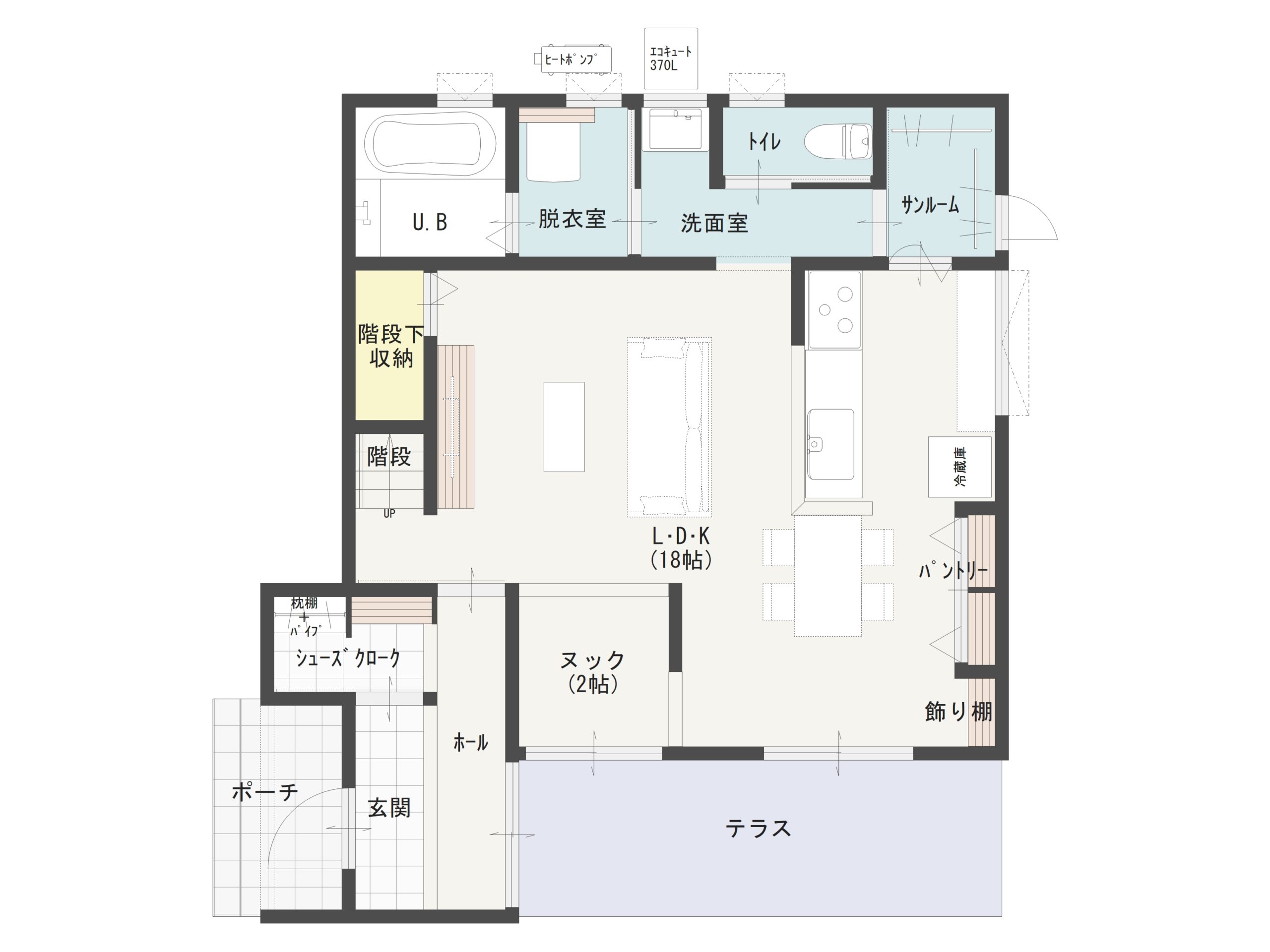 19.5帖のLDKに人気のヌックスペースがあり家族全員でくつろげる空間になっております。広い屋外テラスもありバーベキューや水遊びなど家族団らんのスペースとしても活用できます◎またキッチン→サンルーム→洗面室→脱衣室と一直線で繋がる家事動線はとても快適!この機会にぜひステーツのお家を見に来てください!