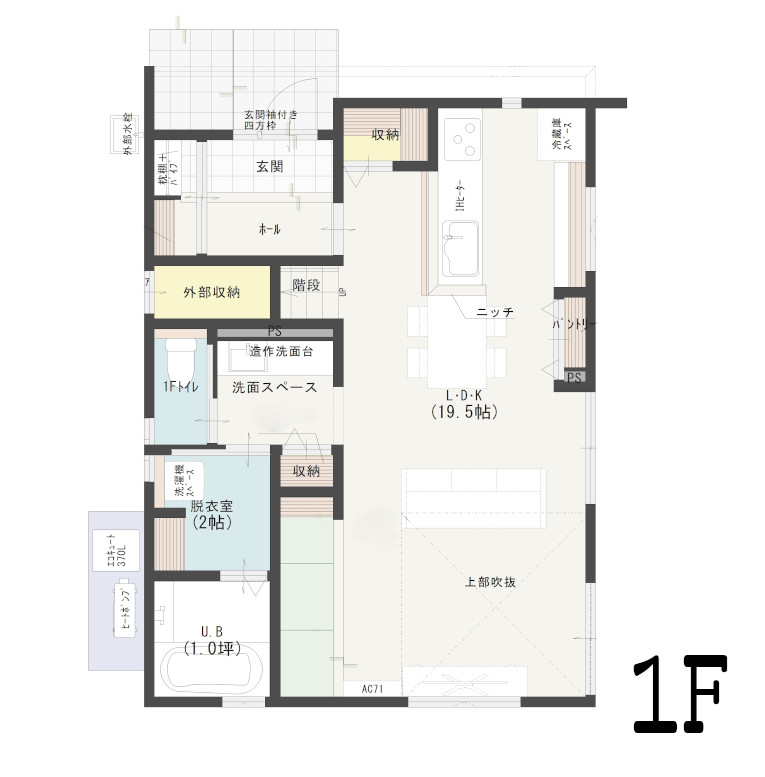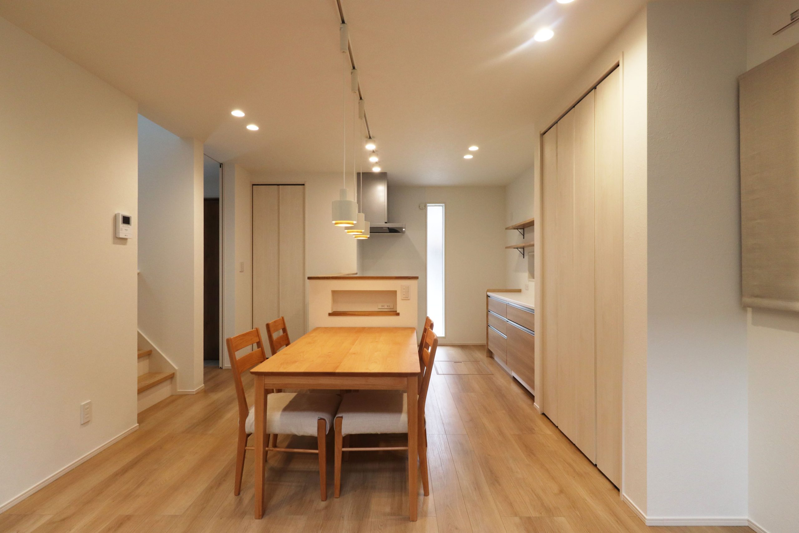 19.5帖の広さで奥行のあるLDKに仕上がりました。リビングは吹抜で開放感抜群で、畳ベンチでゆったり過ごせる空間に。