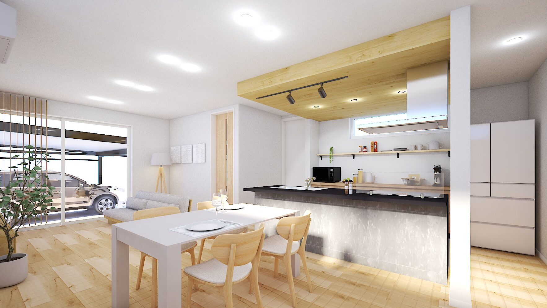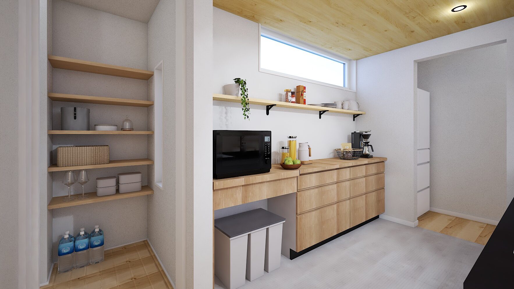 玄関からパントリーへの回遊動線や、アイランドキッチンの周りの動線は無駄のない生活動線となっています