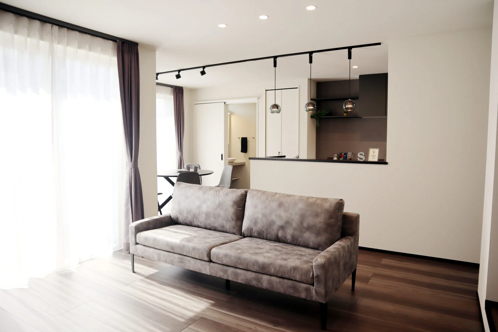 約19帖の広々としたLDKは、キッチン周りを回遊できる設計で、家族が自然と集まりやすい空間を実現