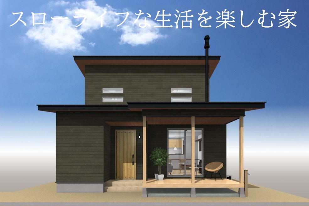 施主様こだわりの薪ストーブ&カバードデッキを設けたお住まいが完成。テーマカラーは緑!外壁や室内の壁紙に「緑色」を取り入れてフレッシュな空間を作りあげました。リビングは勾配天井にしてコンパクトなお家ながらも開放感のある雰囲気に仕上げました。