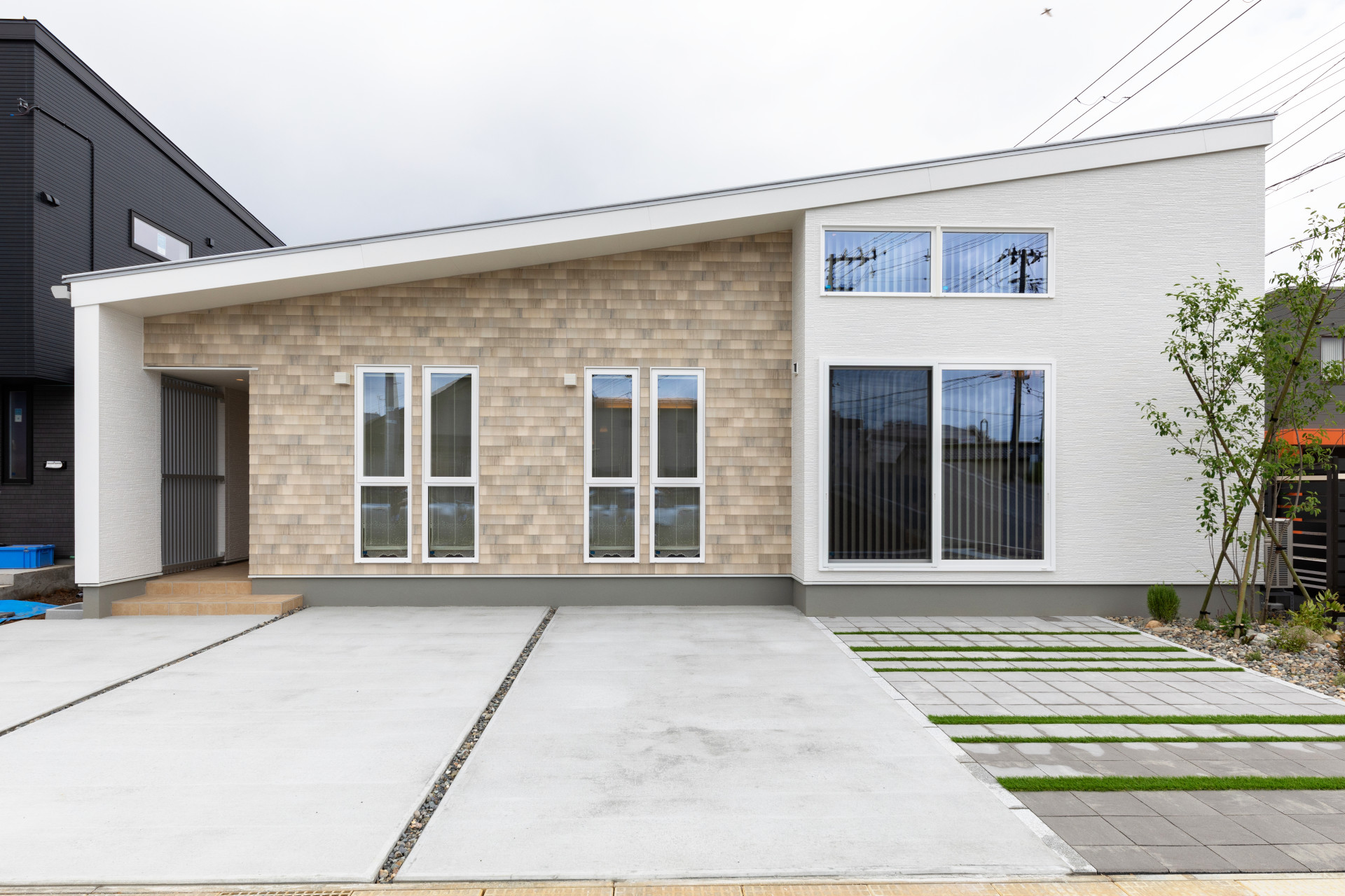 片流れ屋根のモダンな外観。モデルハウス仕様の大きな小屋裏のある平屋の家。
