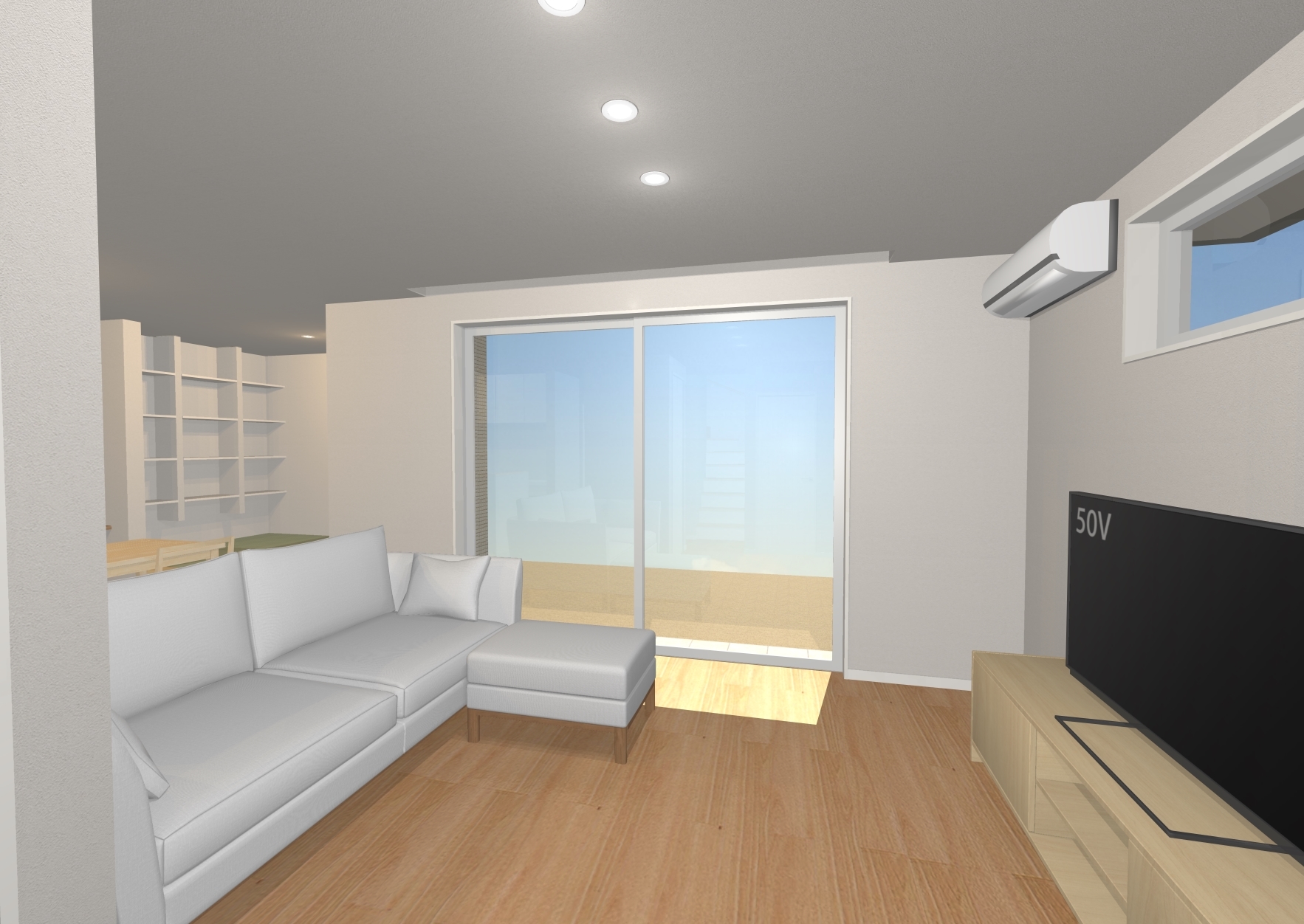 大きなサッシからたくさんの光が差し込む明るいリビング