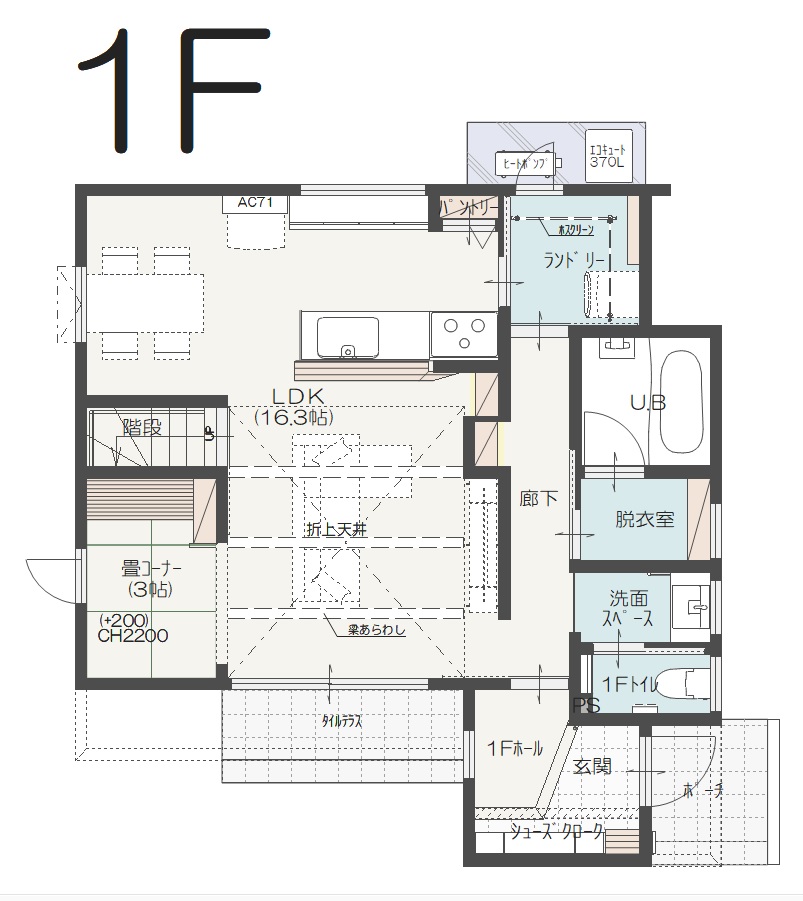 ・一直線に繋がりをもたせた水回りの動線。玄関の近くに洗面台を設置、ただいま手洗い習慣が自然と身に付きます。