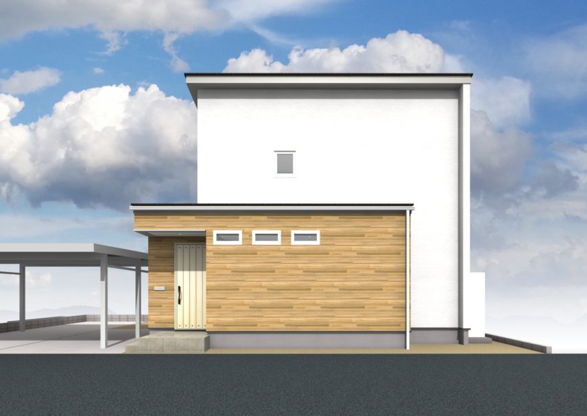 ・外壁はすっきりとした白ベースに、色彩豊かな木目柄をアクセントに加えたナチュラルなお家。