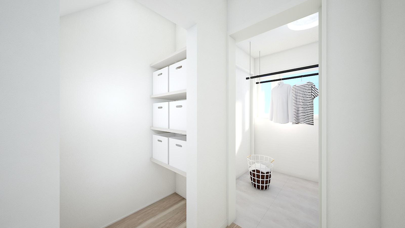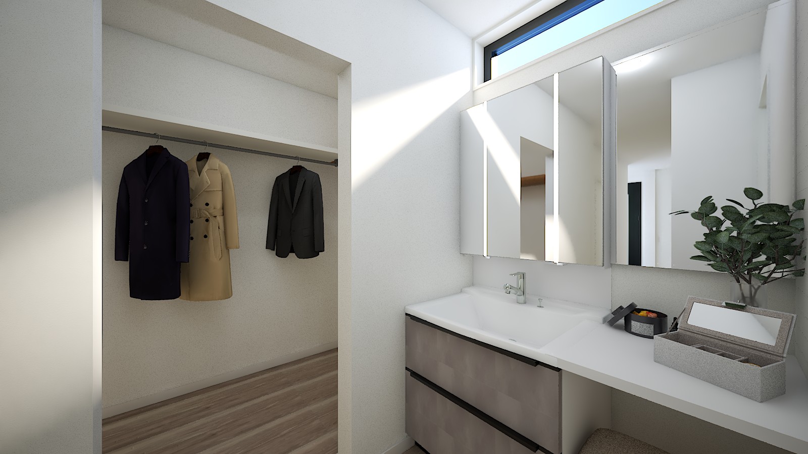 さらに、ファミリークローゼット・洗面スペース・脱衣室・サンルームを一直線につなげた動線設計で、